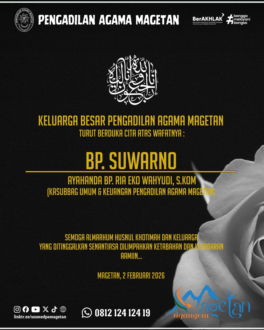 Turut Berduka Cita Atas Wafatnya : Bp.Suwarno (Ayahanda Bp. Ria Eko Wahyudi, S.Kom) , Kasubbag Umum & Keuangan) Written by Admin on 02 February 2026. Written by Admin on 02 February 2026. Hits: 56