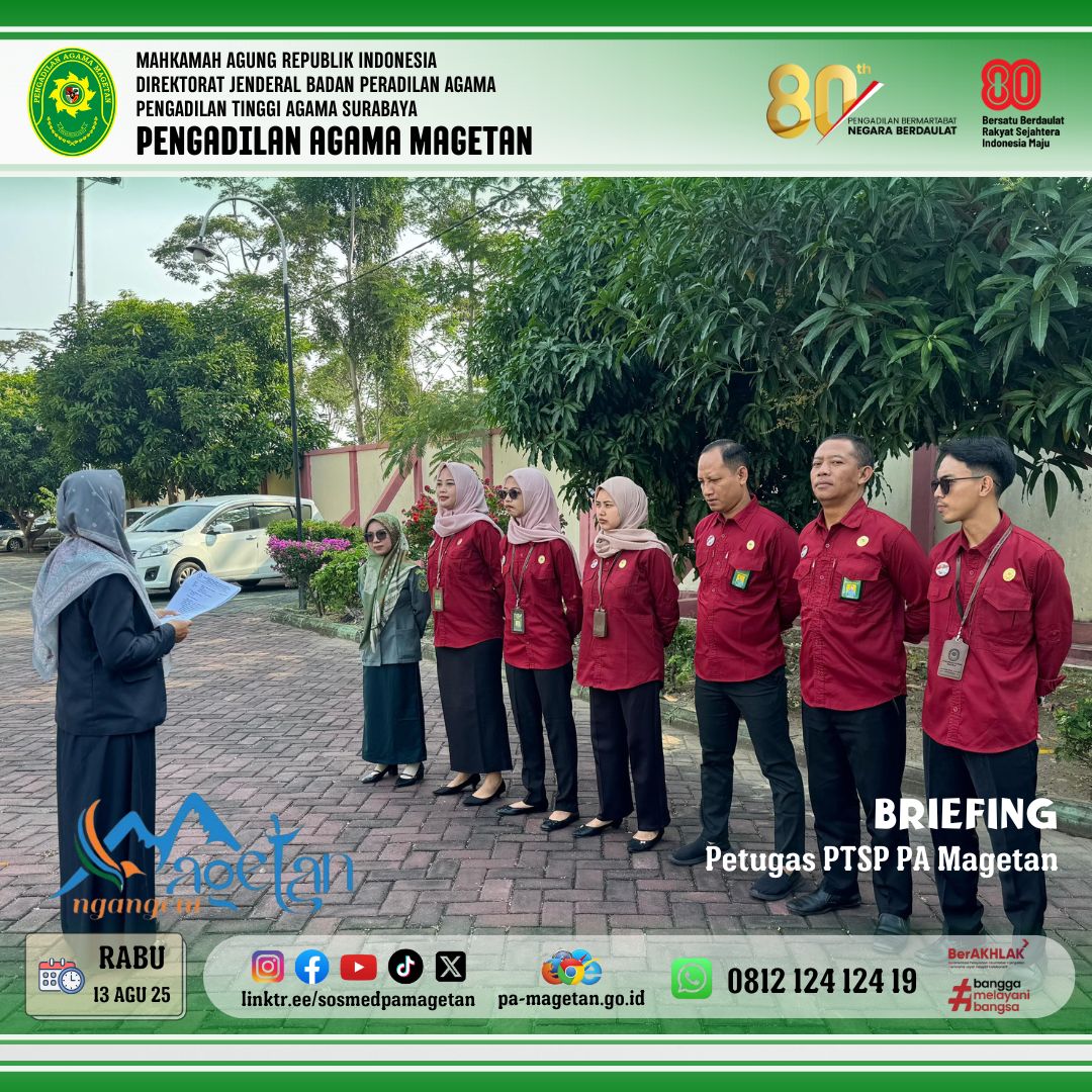 Magetan | pa-magetan.go.id | Pada Rabu (13/08/2025), petugas Pelayanan Terpadu Satu Pintu (PTSP) Pengadilan Agama Magetan mengikuti briefing yang dipimpin langsung oleh Panitera, Ibu Hj. Nilna Niamatin, S.Ag., M.H. Kegiatan ini dilaksanakan setelah melaksanakan Morning Briefing dengan tujuan memberikan arahan dan evaluasi terhadap pelayanan yang telah berjalan. Seluruh petugas PTSP hadir lengkap untuk menyimak instruksi dan saran yang disampaikan. Briefing berlangsung dalam suasana serius namun tetap komunikatif.
