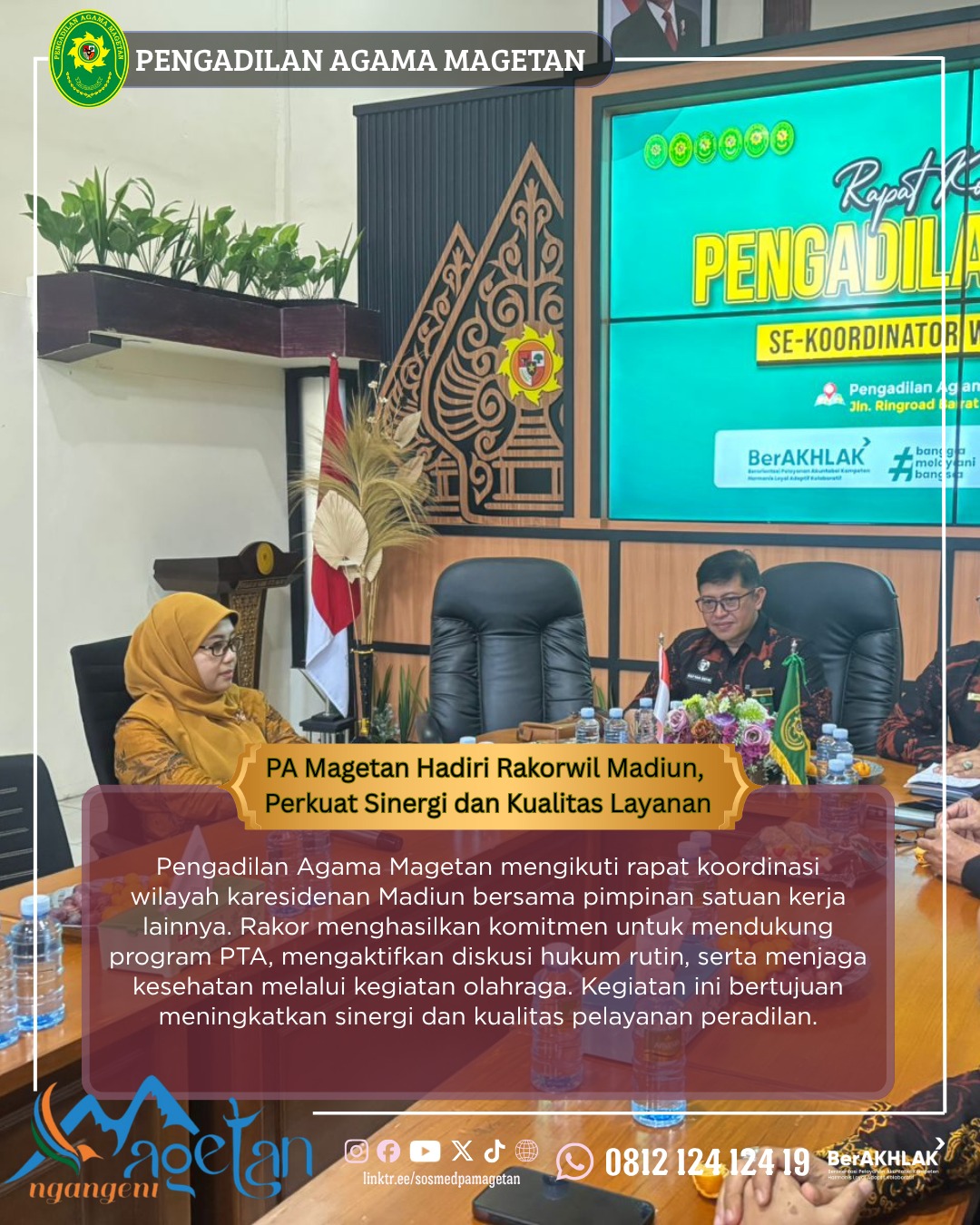 Pengadilan Agama Magetan mengikuti rapat koordinasi (rakor) wilayah Madiun pada Jumat, 17 April 2026. Kegiatan ini dilaksanakan di Pengadilan Agama Kota dan diikuti oleh para Ketua, Panitera, serta Sekretaris dari satuan kerja Pengadilan Agama se-karesidenan Madiun. Dari PA Magetan, hadir Ketua Dr. Hermin Sriwulan, S.H.I., S.H., M.H.I., Panitera Hj. Nilna Niamatin, S.Ag., M.H., dan Sekretaris Onis Nur Islahi, S.Sos., M.M. Rakor ini bertujuan memperkuat koordinasi dan sinergi antar satuan kerja.