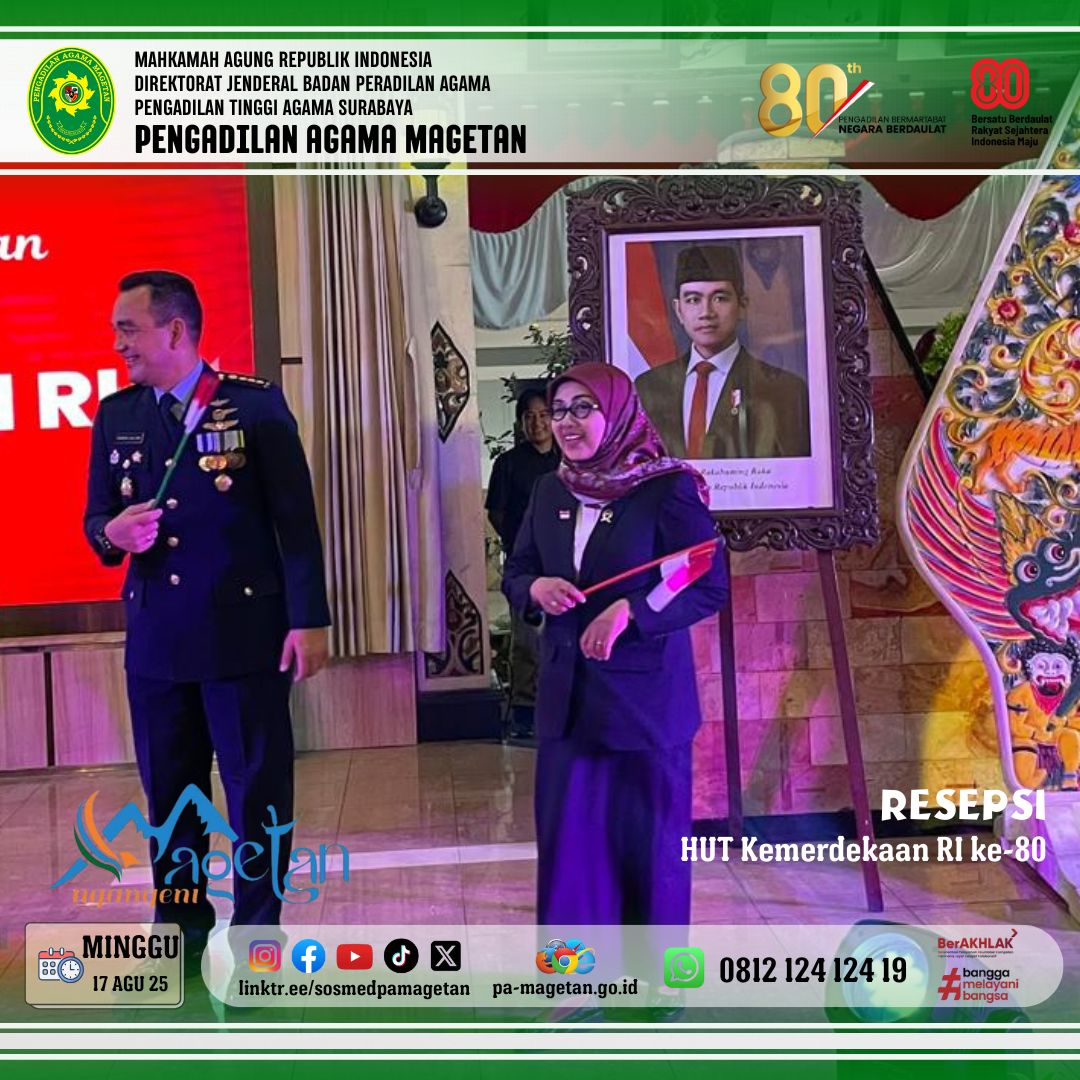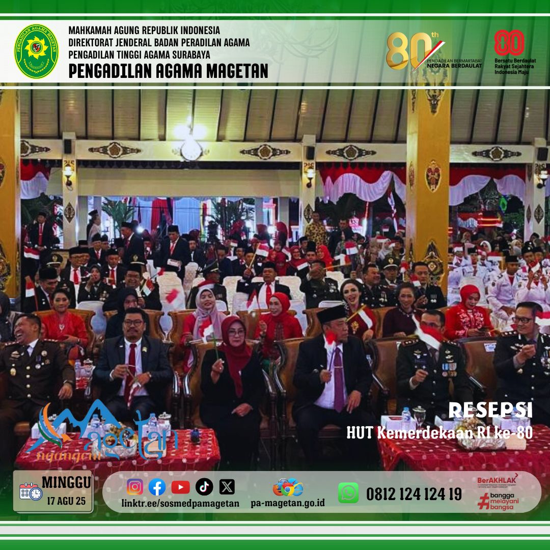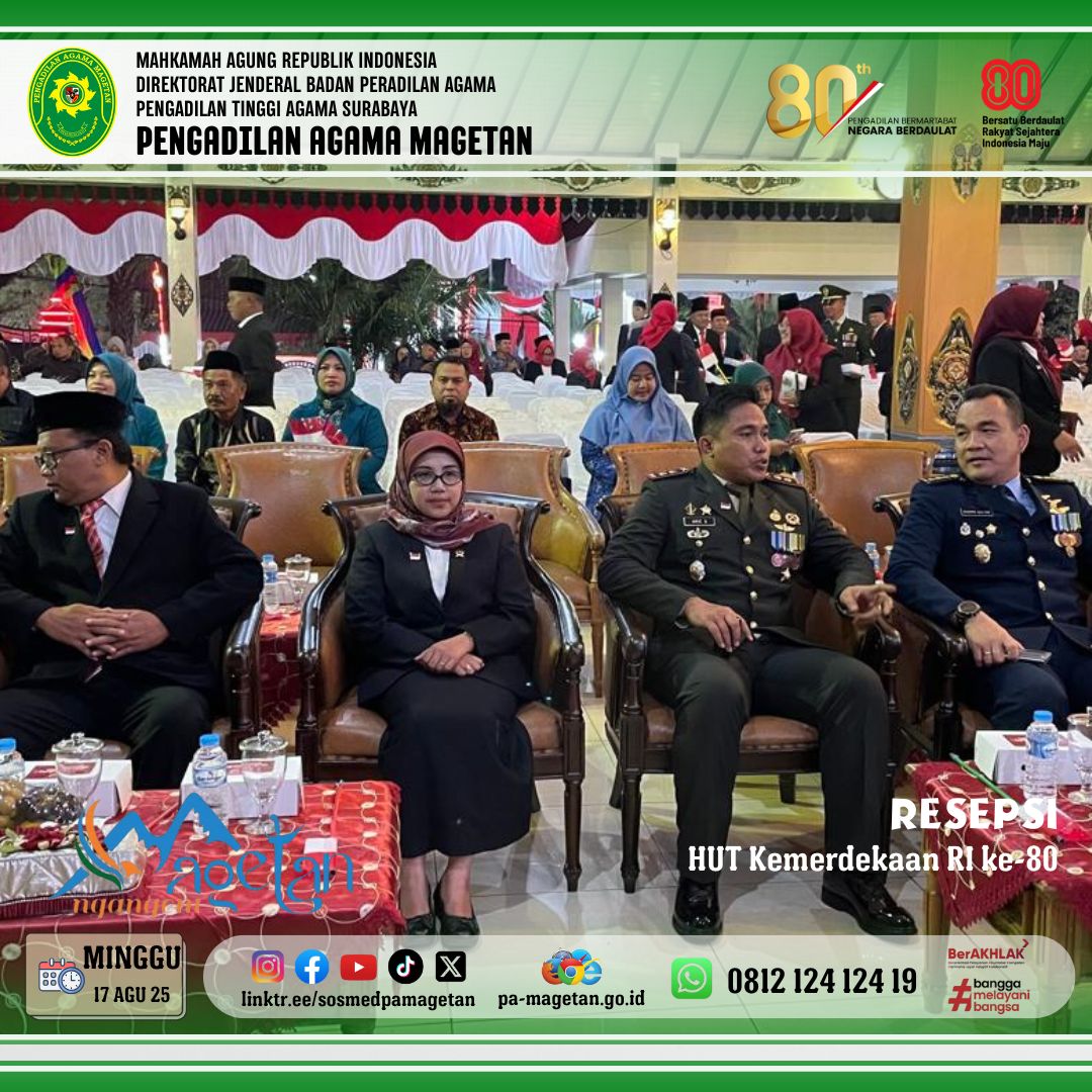 Minggu, (17/08/2025). [pa-magetan.go.id ] Bertempat di Pendopo Surya Graha Magetan, dilaksanakan Resepsi Hari Ulang Tahun Kemerdekaan Republik Indonesia yang ke-80 tahun 2025 pada hari Minggu (17/8). Hadir pada acara tersebut Bupati Magetan, Anggota Forkopimda, Pejabat Sekretaris Daerah Kabupaten Magetan, Para Asisten dan Staf Ahli Bupati, Kepala OPD di lingkungan Kabupaten Magetan, Jajaran Pejabat Vertikal, Pasukan Paskibraka dan para tamu undangan lainnya. Dalam acara tersebut, Pengadilan Agama Magetan diwakili oleh Ketua YM. Dr. Hermin Sriwulan, S.H.I., S.H., M.H.I.