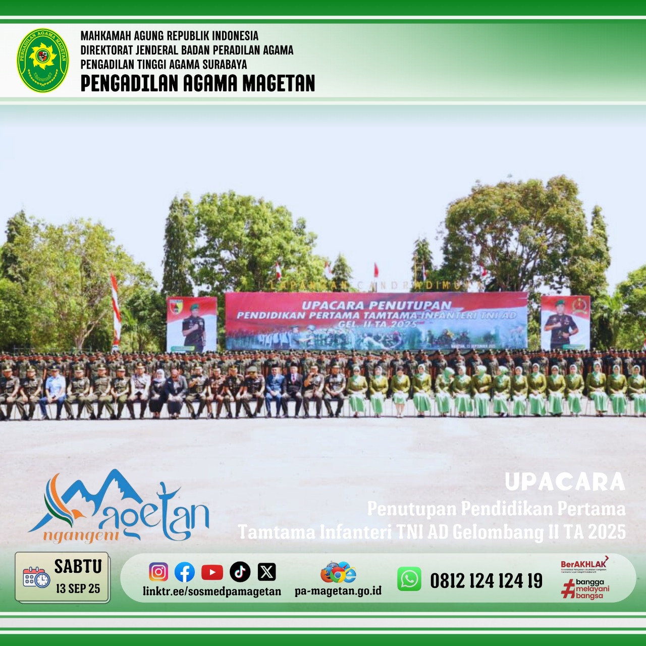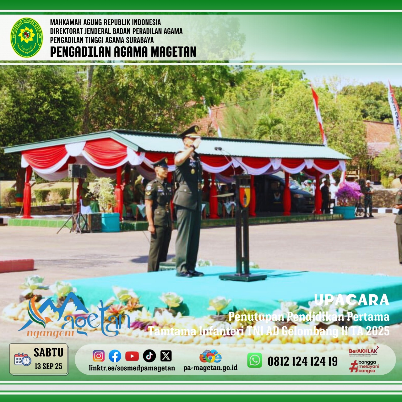 Magetan | pa-magetan.go.id | Bertempat di Lapangan Chandradhimuka Secata Rindam V/Brawijaya, dilaksanakan Upacara Penutupan Pendidikan Pertama Tamtama Infanteri TNI AD Gelombang II TA 2025 pada hari Sabtu (13/9). Turut hadir dalam upacara tersebut Wakil Bupati Magetan, serta Forkopimda Kabupaten Magetan. Dalam acara tersebut, Pengadilan Agama Magetan diwakili oleh Ketua YM. Dr. Hermin Sriwulan, S.H.I., S.H., M.H.I.