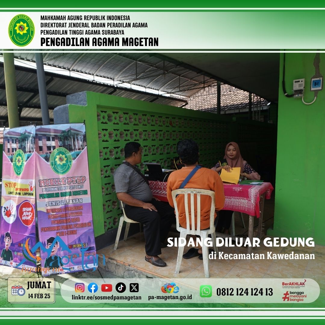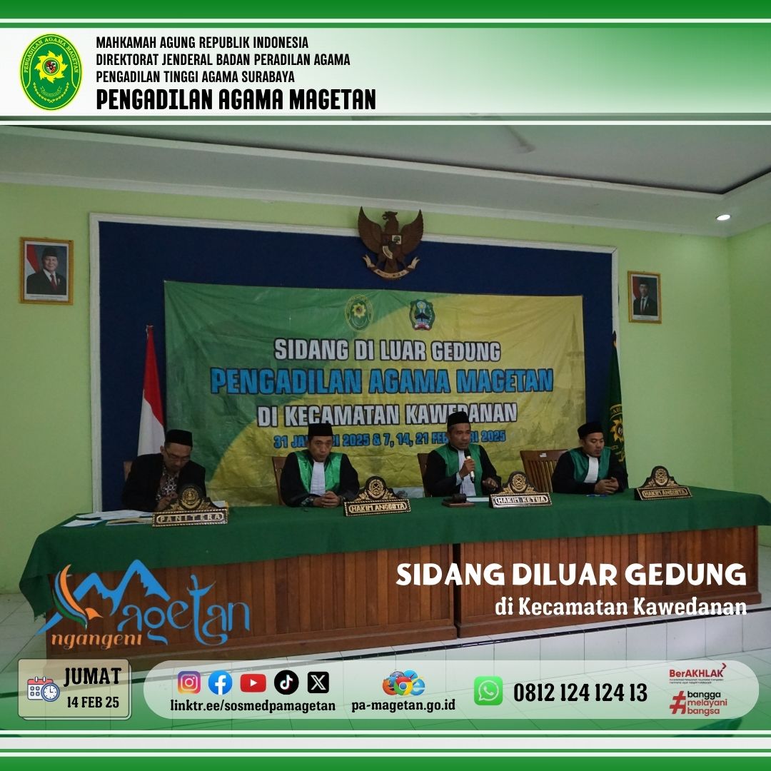 Magetan | pa-magetan.go.id | Jumat, 14 Februari 2025. Bertempat di Kantor Kecamatan Kawedanan, Pengadilan Agama Magetan melaksanakan kegiatan Sidang Diluar Gedung sekaligus pengenalan inovasi terbaru dari Pengadilan Agama Magetan, Bujang Sarangan. Kegiatan Diluar Gedung ini dipimpin oleh Wakil Ketua Pengadilan Agama Magetan, Huda Lukoni, S.H.I., S.H., M.H. dan dihadiri oleh seluruh tim yang bertugas dalam penyelenggaraan Sidang Diluar Gedung.