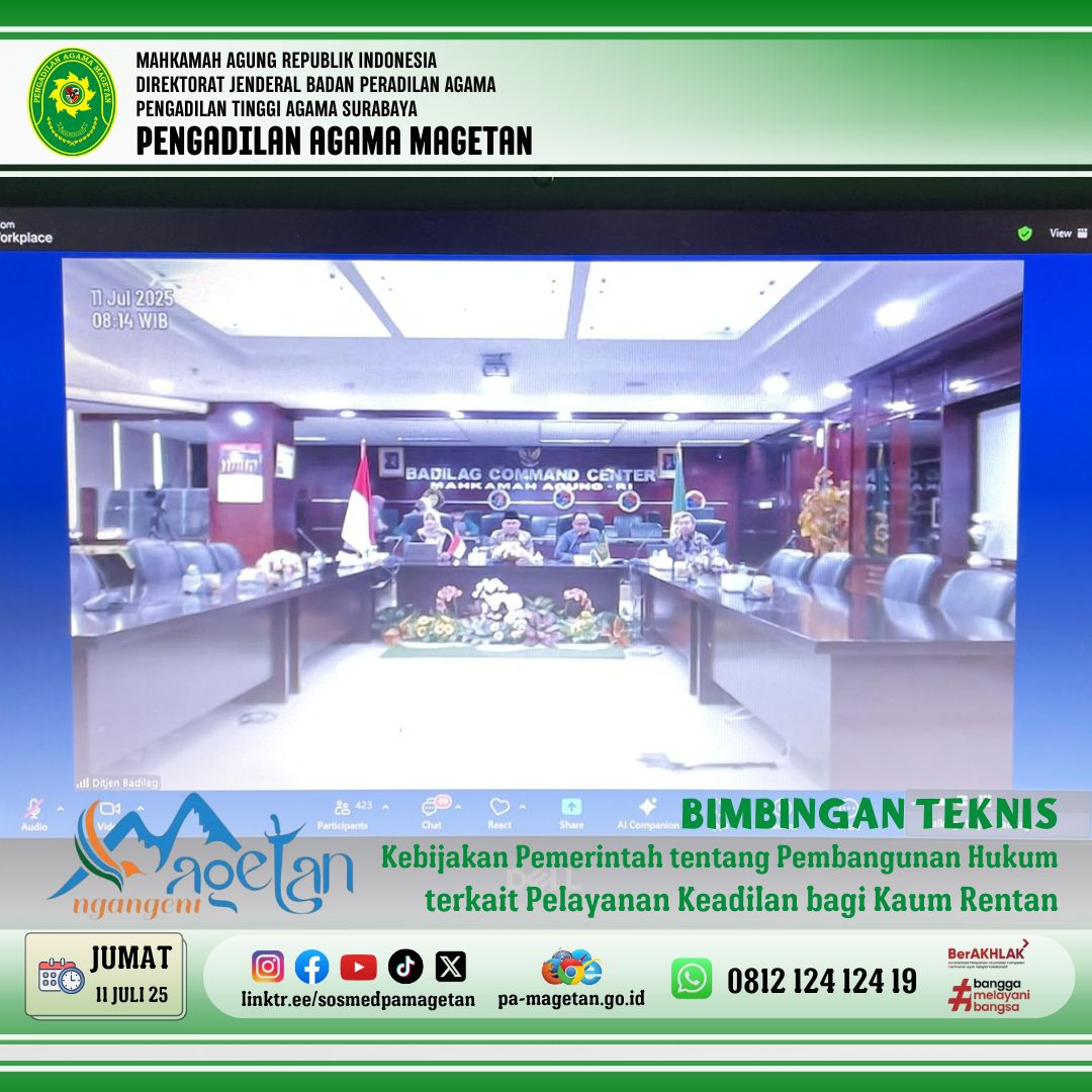 Magetan | pa-magetan.go.id | PA Magetan ikuti Bimtek Pelayanan Hukum Bagi Kaum Rentan. Bertempat di Ruang Media Center, Wakil Ketua Pengadilan Agama Magetan, Bapak Huda Lukoni, S.H.I., S.H., M.H., bersama para hakim mengikuti kegiatan Bimbingan Teknis secara daring pada Jumat (11/7/25) pukul 08.00 WIB. Kegiatan ini dilaksanakan secara online yang bekerja sama dengan Bappenas. Tema yang diangkat adalah “Kebijakan Pemerintah tentang Pembangunan Hukum terkait Pelayanan Keadilan bagi Kaum Rentan.” Acara ini dihadiri oleh peserta dari berbagai satuan kerja di seluruh Indonesia.