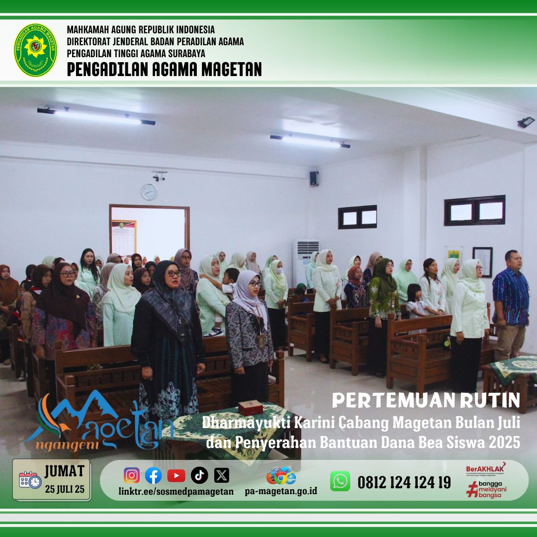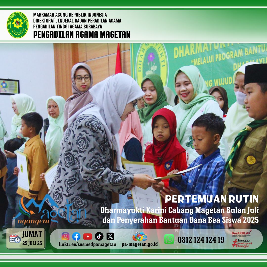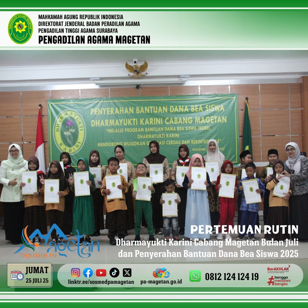 Magetan | pa-magetan.go.id | Pada Jumat, 25 Juli 2025 acara diawali dengan menyanyikan Lagu Hymne Dharmayukti Karini dan Mars Dharmayukti Karini, yang dilanjutkan dengan sambutan dari Ketua Pengadilan Negeri Magetan, Ibu Mayasari Oktavia, S.H., M.H. selaku Ketua Pengadilan Negeri Magetan. Kemudian dilanjutkan dengan pemberian Bantuan Dana Bea Siswa (BDBS) kepada 18 penerima. Acara tersebut merupakan agenda rutin Dharmayukti Karini yang dilaksanakan setiap tahun, yang dimana sumber dana diperoleh dari para donator baik dari Pengadilan Negeri Magetan maupun Pengadilan Agama Magetan. Acara dilanjutkan dengan laporan ketua Panitia, sambutan dari Ibu Sri Peni Rintis Candra, S.H., M.H. selaku Ketua Cabang Dharmayukti Karini Cabang Magetan.