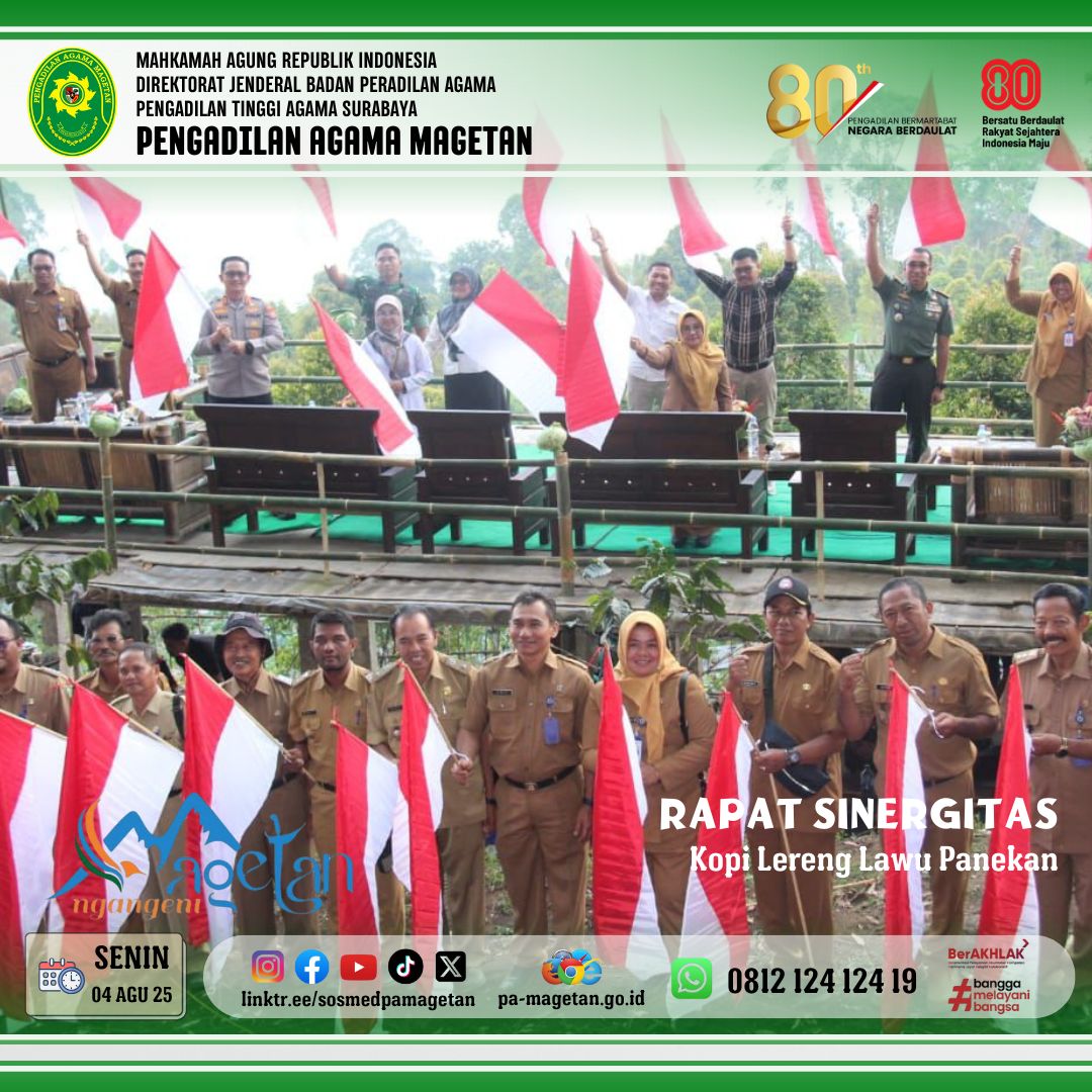 Rapat koordinasi Forkopimda digelar pada Senin, 4 Agustus 2025 di Dukuh Trolelo, Desa Ngiliran, Kecamatan Panekan, Kabupaten Magetan. Acara ini membahas sharing tentang pengembangan budidaya kopi antara pihak desa dan Forkopimda. Bupati Magetan hadir langsung memimpin jalannya rapat koordinasi tersebut. Ketua Pengadilan Agama Magetan Ibu Dr. Hermin Sriwulan, S.H.I., S.H., M.H.I., turut hadir mewakili lembaganya dalam kegiatan ini.