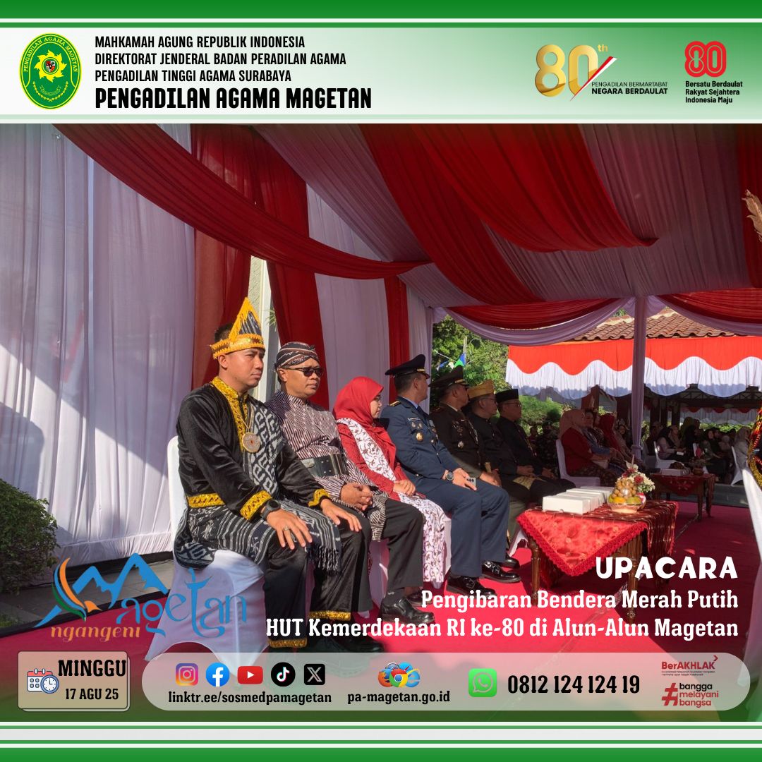 Minggu, (17/08/2025). [pa-magetan.go.id ] Bertempat di Alun-Alun Kabupaten Magetan, dilaksanakan Upacara Pengibaran Bendera Merah Putih dalam rangka peringatan Hari Ulang Tahun Kemerdekaan Republik Indonesia yang ke-80 tahun 2025 pada hari Minggu (17/8). Upacara tersebut diikuti oleh Bupati Magetan, Forkopimda, Sekda Kab Magetan, seluruh Kepala OPD, BUMD, TNI/Polri serta siswa siswi SMA sederajat di Magetan. Pengadilan Agama Magetan diwakili oleh Ketua YM. Dr. Hermin Sriwulan, S.H.I., S.H., M.H.I.