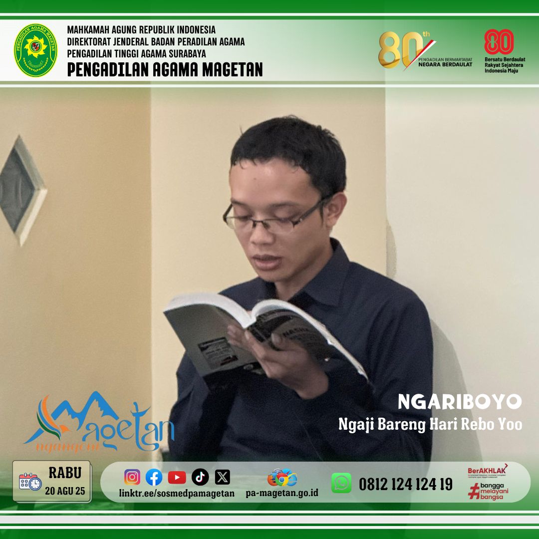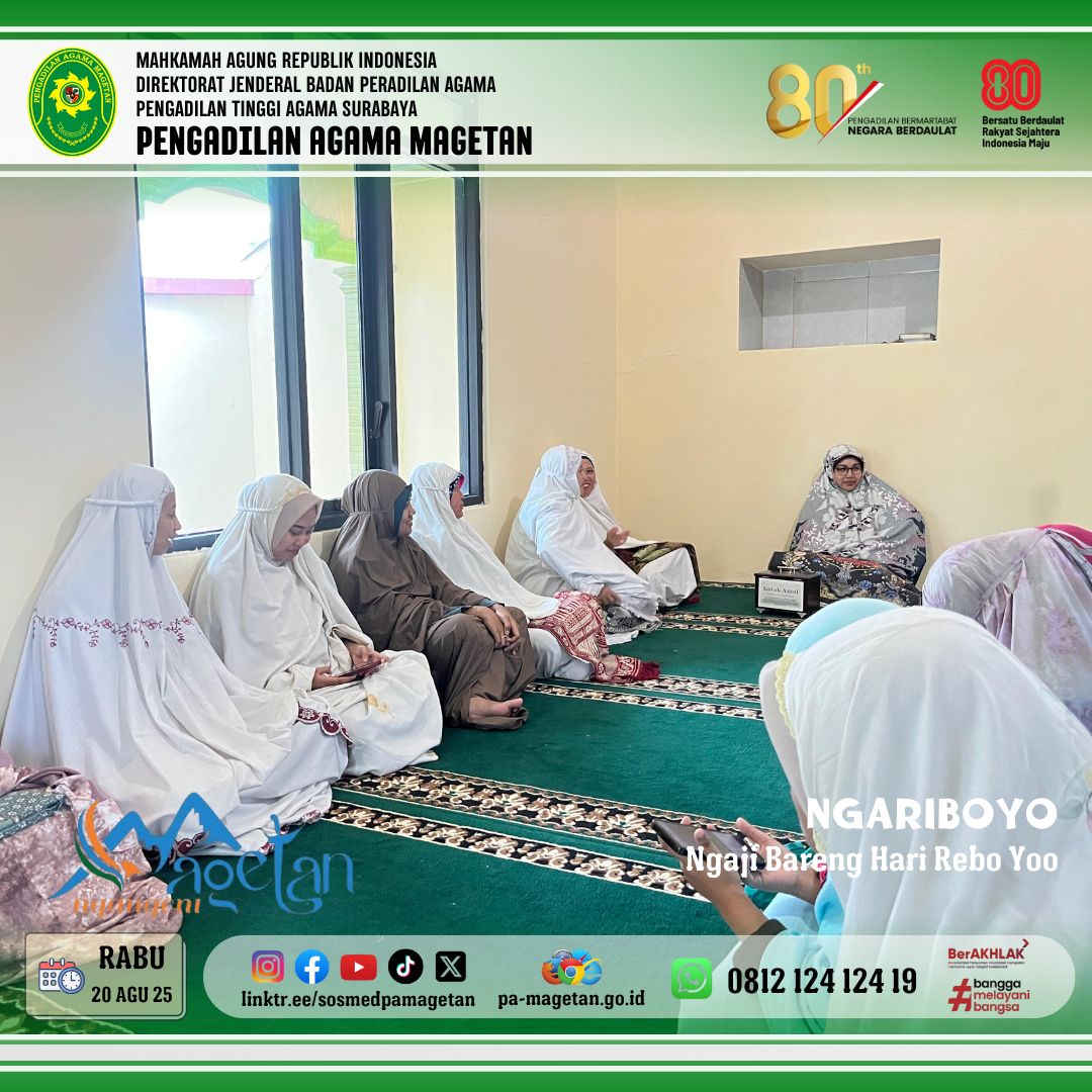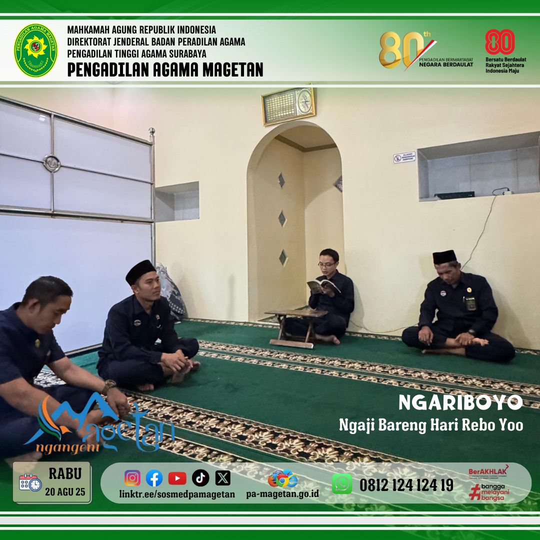 Magetan | pa-magetan.go.id | Pada Rabu (20/08/2025) Pengadilan Agama Magetan menyelenggarakan kegiatan rutin NGARIBOYO (Ngaji Hari Rabo Ayoooo...) di Musholla Al-Mahkamah. Kegiatan ini diikuti oleh aparatur serta jamaah yang hadir dengan penuh semangat dan antusiasme. Suasana menjadi lebih khidmat setelah pelaksanaan Sholat Ashar berjamaah. Tujuan kegiatan ini adalah untuk meningkatkan pengetahuan agama sekaligus memperkuat ukhuwah islamiyah.