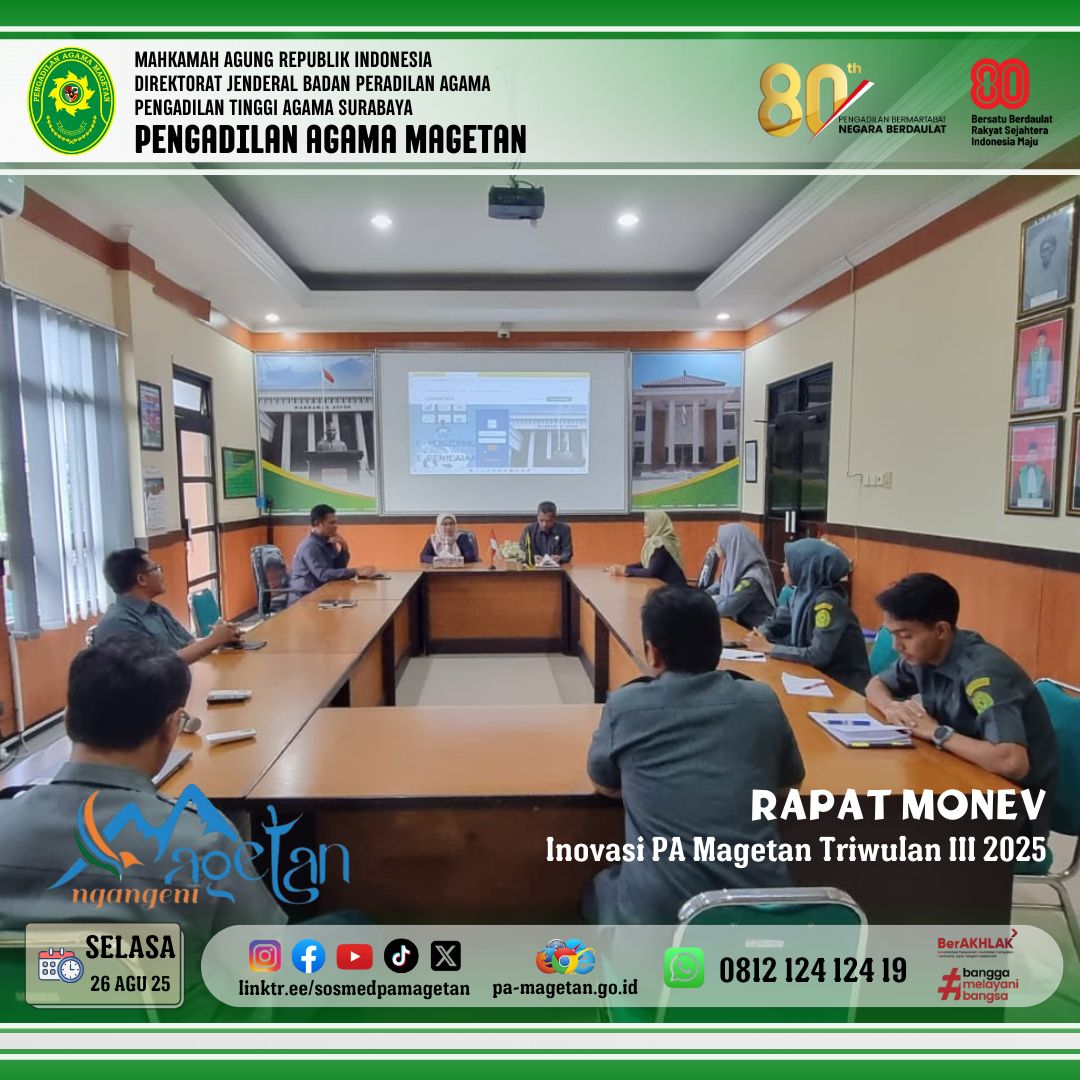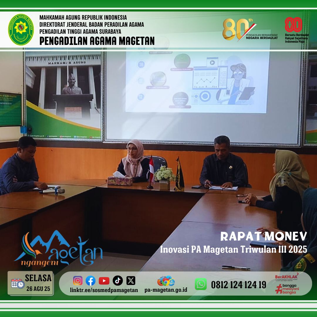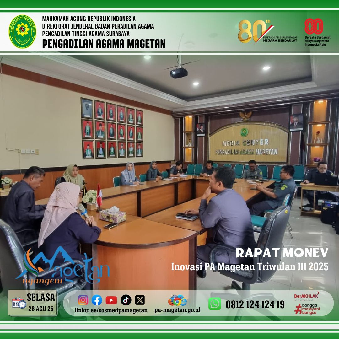 Magetan | pa-magetan.go.id |Dalam rangka memperkuat komitmen pembangunan Zona Integritas menuju Wilayah Bebas dari Korupsi (WBK), Pengadilan Agama Magetan menyelenggarakan Rapat Monitoring dan Evaluasi Inovasi pada Selasa, 26 Agustus 2025 di Media Center Pengadilan Agama Magetan. Kegiatan ini dipimpin langsung oleh Ketua Pengadilan Agama Magetan, Dr. Hermin Sriwulan, S.H.I., S.H., M.H.I., didampingi oleh Wakil Ketua Huda Lukoni, S.H.I., S.H., M.H., Panitera Hj. Nilna Niamatin, S.H., M.H., Plt. Sekretaris Ria Eko Wahyudi, S.H., serta diikuti oleh seluruh Tim Inovasi Pengadilan Agama Magetan.