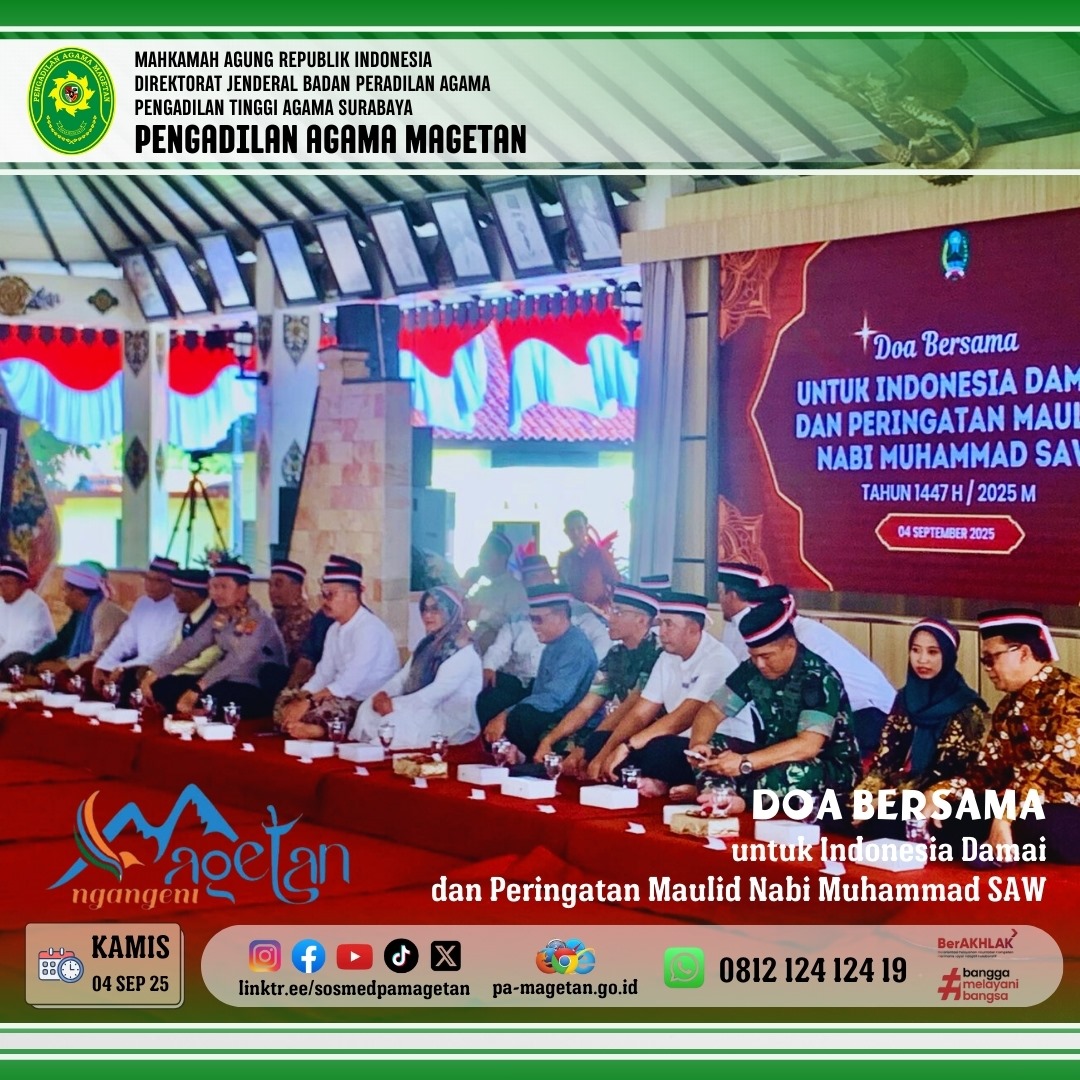 Magetan | pa-magetan.go.id | Bertempat di Pendopo Surya Graha Magetan, dilaksanakan kegiatan Doa Bersama untuk Indonesia Damai sekaligus Peringatan Maulid Nabi Muhammad SAW 1447 H/2025 M. Acara ini dihadiri oleh Forkopimda Kabupaten Magetan, tokoh agama, organisasi masyarakat, dan Pengadilan Agama Magetan diwakili oleh Uswatul Fikriyah, S.H.I, M.H.serta berbagai elemen masyarakat. Doa bersama dipanjatkan demi terwujudnya persatuan, keselamatan, dan keberkahan bangsa Indonesia. Suasana religius dan penuh kebersamaan terasa sepanjang acara.