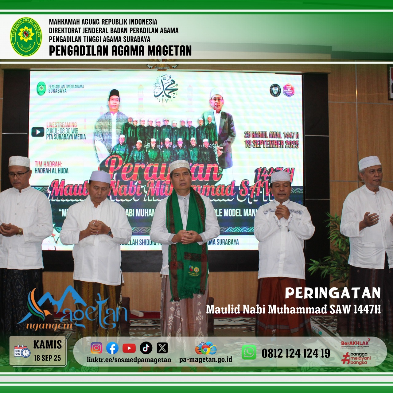 Magetan | pa-magetan.go.id | PA Magetan Hadiri Perayaan Maulid Nabi Muhammad SAW di PTA Surabaya. Pada Kamis (18/09/2025) bertempat di Pengadilan Tinggi Agama Surabaya dilaksanakan Perayaan Maulid Nabi Muhammad SAW 1447 H dengan tema “Meneladani Akhlaq Nabi Muhammad SAW Sebagai Role Model Manusia”. Acara dimulai pukul 08.30 WIB dan juga disiarkan secara langsung melalui kanal PTA Surabaya Media. Suasana perayaan berlangsung penuh khidmat dengan lantunan hadrah dari Tim Hadrah Al Huda.