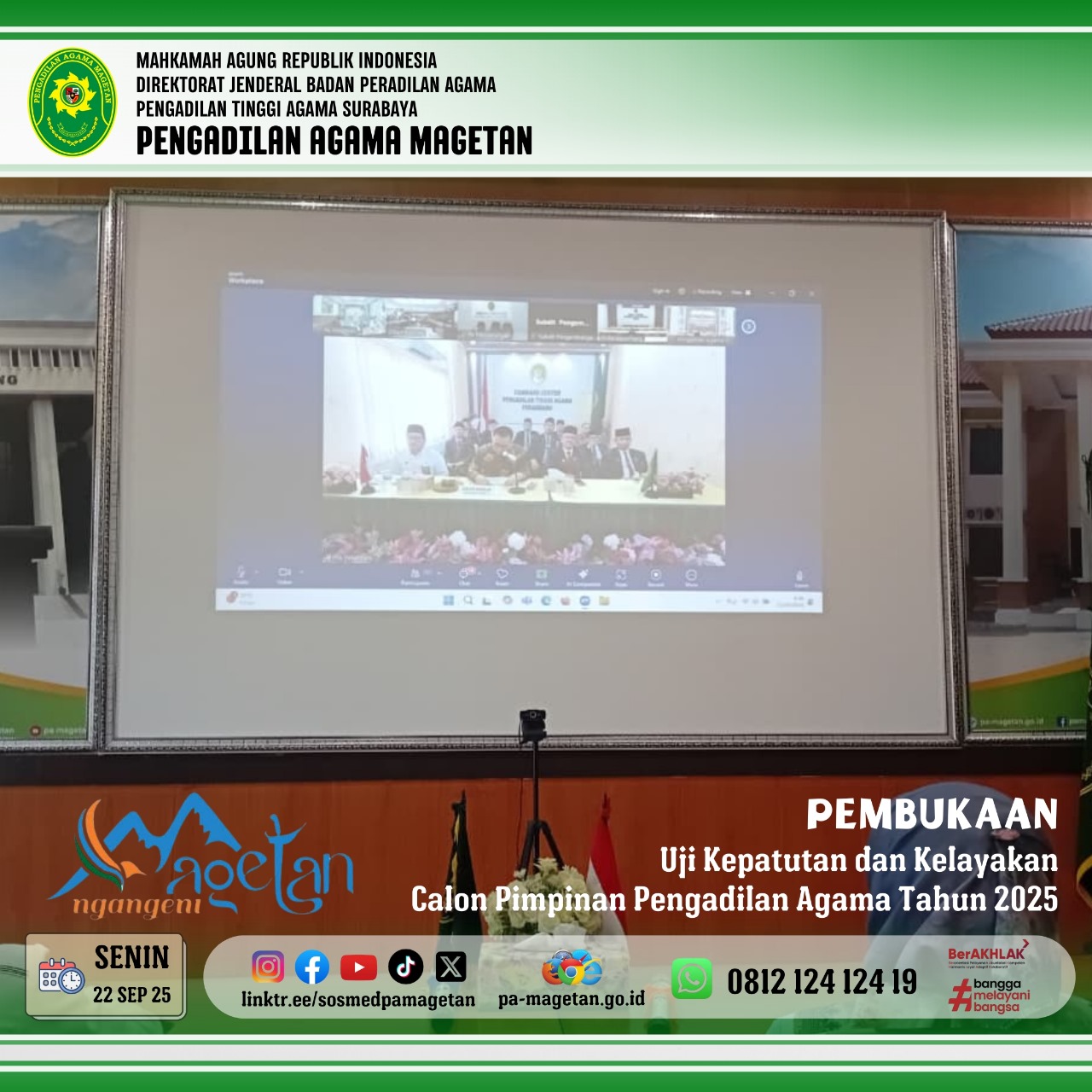 Magetan | pa-magetan.go.id | Direktorat Jenderal Badan Peradilan Agama mengadakan upacara pembukaan kegiatan Uji Kepatuhan dan Kelayakan (Fit and Proper Test) calon pimpinan pengadilan di lingkungan Peradilan Agama tahun 2025. Acara tersebut dilaksanakan secara virtual melalui aplikasi Zoom pada Senin, 22 September 2025, pukul 08.00 WIB. Upacara ini dihadiri oleh Dirjen Badilag MA, Pimpinan Pengadilan Tingkat Banding, Pimpinan Pengadilan Tingkat Pertama, para Penguji, dan Peserta dari pengadilan agama. Hadir pula Ketua Pengadilan Agama Magetan Dr. Hermin Sriwulan, S.H.I., S.H., M.H.I. dan Luqman Hariyadi, S.H., M.H., sebagai hakim/peserta yang mengikuti fit and proper test.