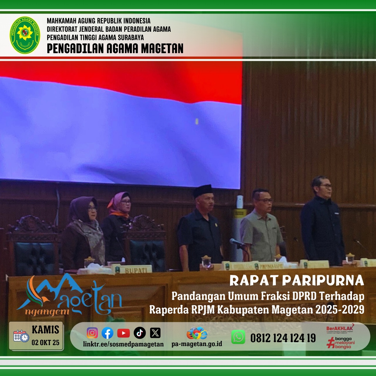 Magetan | pa-magetan.go.id | Kamis (02/10/2025) Pengadilan Agama Magetan menghadiri Rapat Paripurna DPRD Kabupaten Magetan dengan agenda Pandangan Umum Fraksi DPRD terhadap Rancangan Peraturan Daerah (Raperda) RPJMD Kabupaten Magetan Tahun 2025–2029. Kegiatan ini digelar di Gedung DPRD Kabupaten Magetan dengan dihadiri jajaran pemerintah daerah serta unsur Forkopimda.