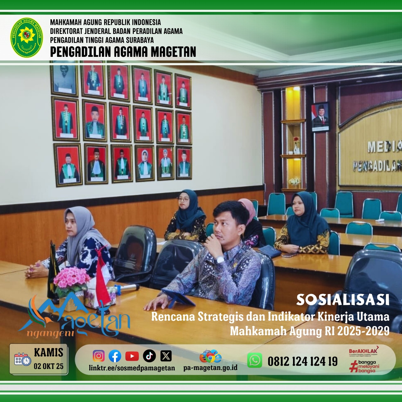 Kegiatan sosialisasi ini diikuti oleh seluruh satuan kerja peradilan di bawah Mahkamah Agung, termasuk Pengadilan Agama Magetan. Dari PA Magetan hadir Sekretaris, Bapak Onis Nur Islahi, S.Sos., M.M., Panitera, Ibu Hj. Nilna Niamatin, S.Ag., M.H., Kasubbag Perencanaan, Teknologi Informasi dan Pelaporan, Ibu Lina Lutfiyah, S.Psi., S.H., serta Staf PTIP, Ibu Titin Oktaviani, S.IAN. Kehadiran jajaran PA Magetan ini menjadi bentuk komitmen untuk mendukung implementasi rencana strategis MA secara terarah dan konsisten.