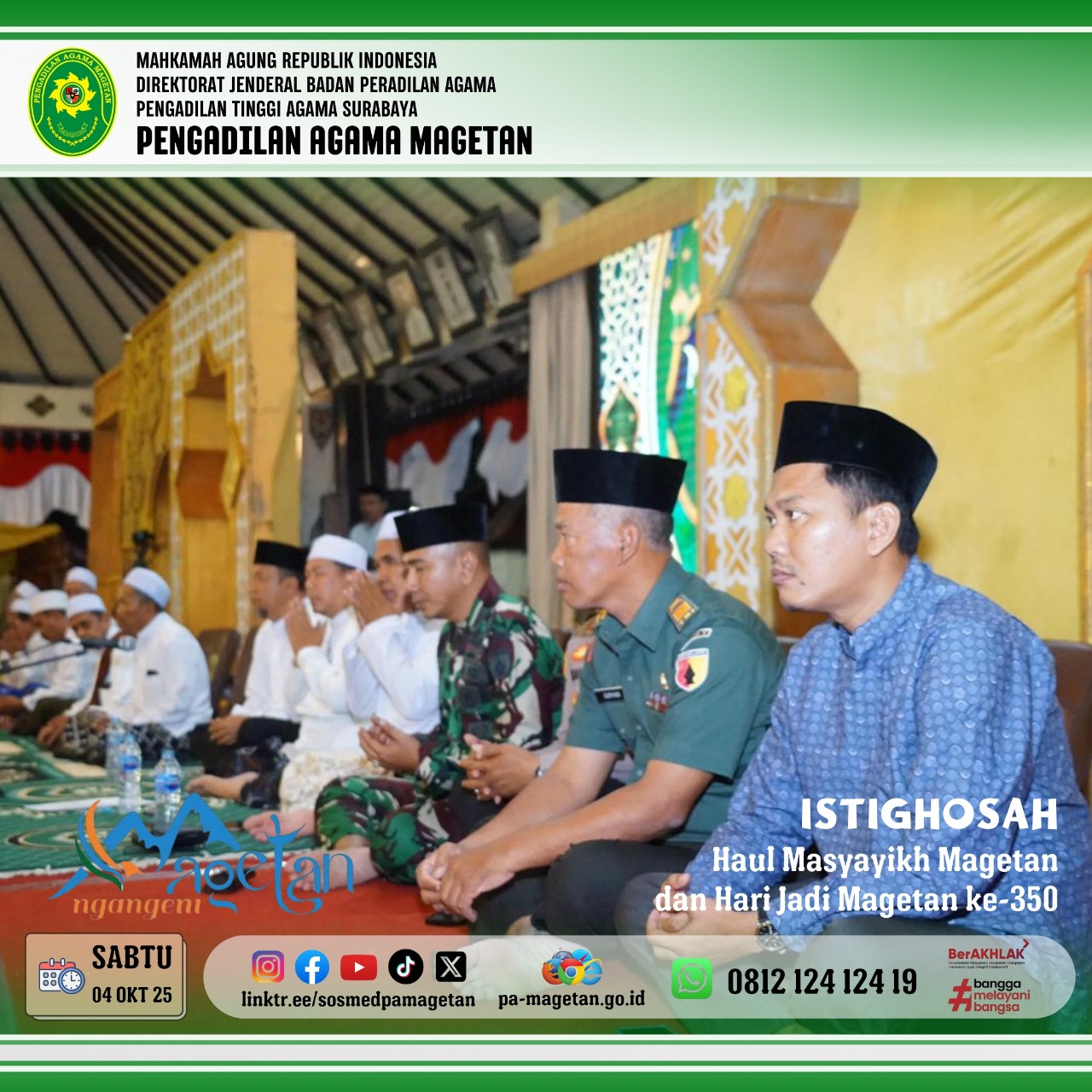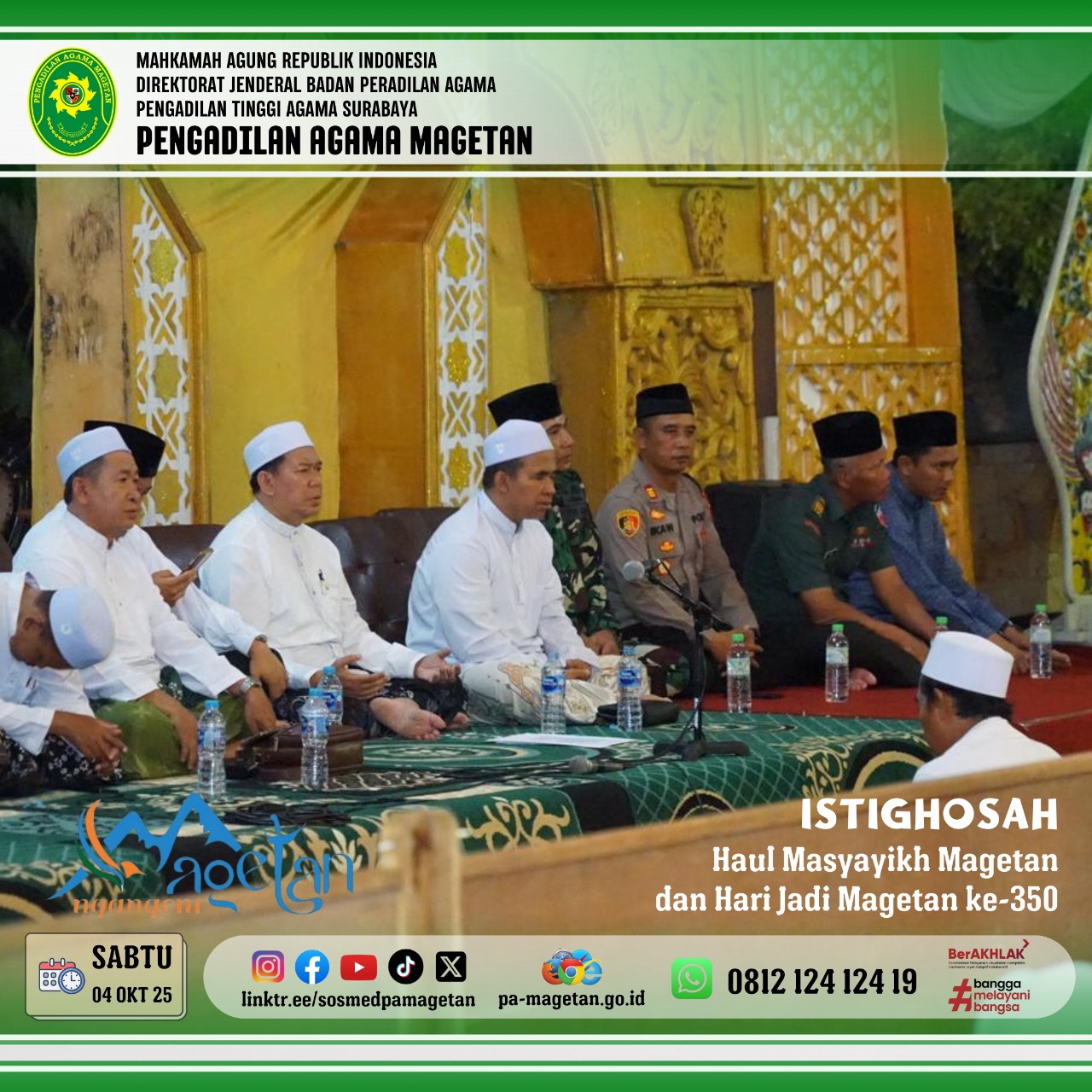 Berbagai unsur pimpinan daerah tampak hadir, menunjukkan sinergi antara ulama dan umaro. Di antara hadirin, Pengadilan Agama Magetan diwakili secara langsung oleh sekretaris, Bapak Onis Nur Islahi, S.Sos., M.M., yang turut serta dalam seluruh rangkaian acara. Kehadiran beliau menegaskan komitmen institusi peradilan agama dalam mendukung kegiatan keagamaan dan pelestarian nilai-nilai luhur daerah.