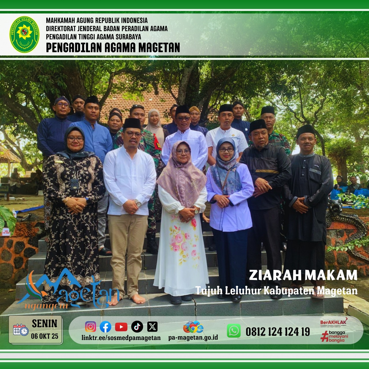 Ketua Pengadilan Agama Magetan, Dr. Hermin Sriwulan, S.H.I., S.H., M.H.I., ikut serta dalam rangkaian kegiatan Hari Jadi ke-350 Kabupaten Magetan. Salah satu agenda yang dilaksanakan pada Senin, 6 Oktober 2025 adalah ziarah ke 7 makam leluhur. Kegiatan ini digelar oleh Pemerintah Kabupaten Magetan sebagai bentuk penghormatan terhadap para tokoh pendiri daerah. Ziarah dilakukan bersama unsur Forkopimda, tokoh masyarakat, serta pejabat daerah lainnya.
