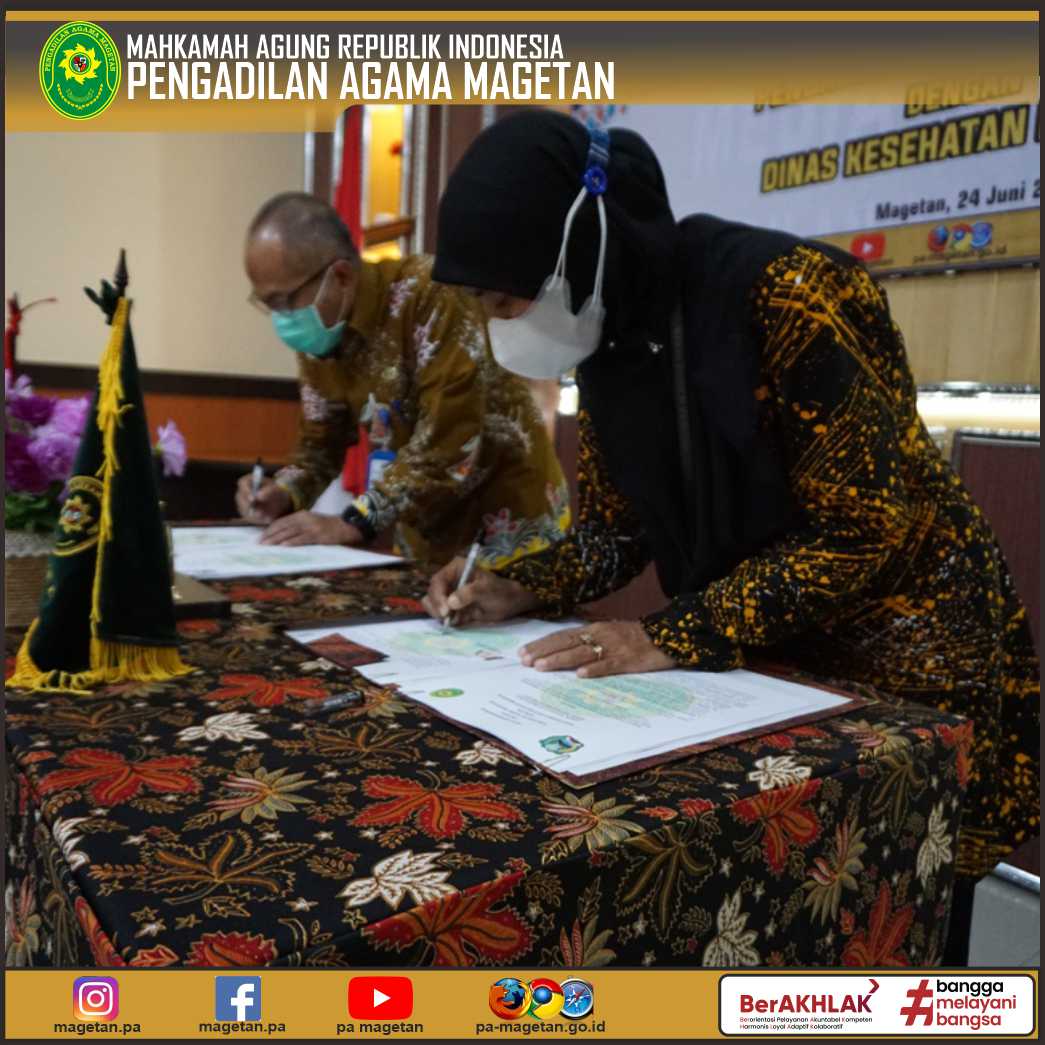 Magetan | pa-magetan.go.id | Pengadilan Agama Magetan melaksanakan Penandatanganan Perjanjian Kerjasama dengan Dinas Kesehatan Magetan. Perjanjian kerjasama ini dilaksanakan dalam rangka pemenuhan Peraturan Mahkamah Agung No. 5 Tahun 2019 tentang Pedoman Mengadili Permohonan Dispensasi Kawin serta menindaklanjuti surat Direktur Jenderal Kesehatan Masyarakat Kementerian Kesehatan Republik Indonesia No. HK.01.2/B/275/2022 tanggal 11 April 2022 tentang tindak lanjut audiensi perkawinan.