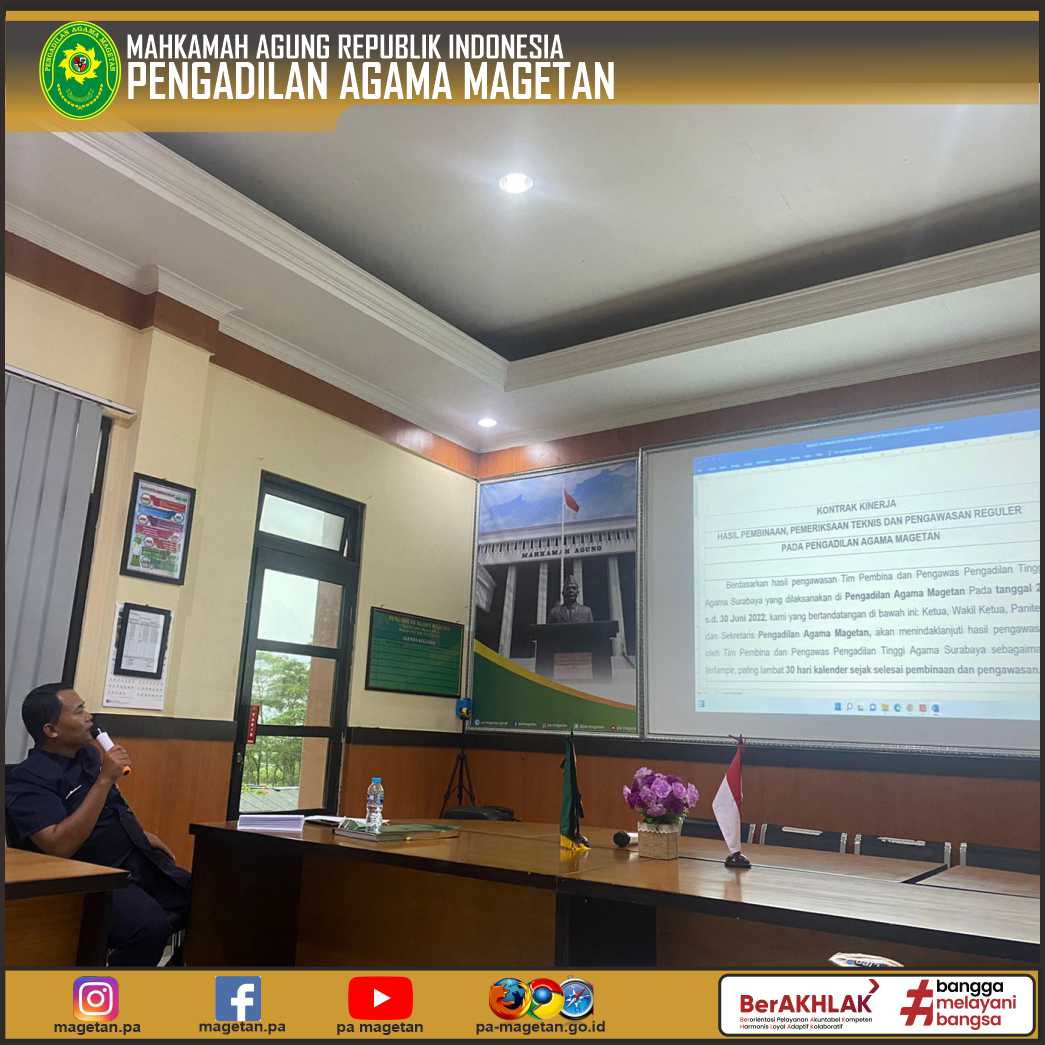 Dalam rapat ini, Panitera Pengadilan Agama Magetan menekankan pentingnya peningkatan pelayanan yang diberikan kepada setiap masyarakat yang datang ke Pengadilan dengan selalu memberikan pelayanan yang terbaik agar sesuai dengan kebutuhan dan harapan masyarakat yang datang ke Pengadilan Agama Magetan.