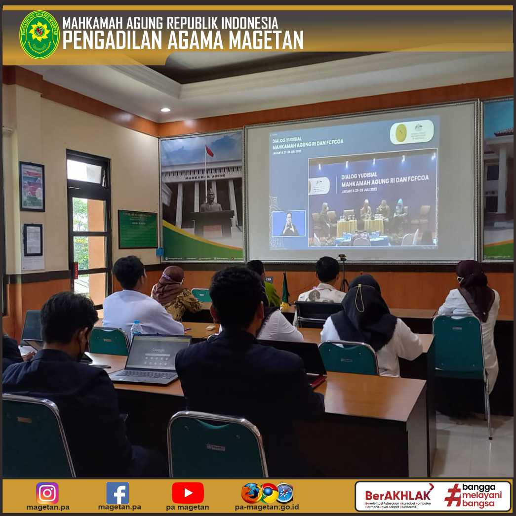 Magetan | pa-magetan.go.id | Pengadilan Agama Magetan mengikuti kembali Dialog Yudisial Indonesia, Australia dan Malaysia : Perlindungan Hak Perempuan dan Anak dalam Perkara Perceraian secara online dari Media Center Pengadilan Agama Magetan. Kegiatan yang diikuti oleh Wakil Ketua, Para Hakim, Plh. Panitera, Para Panitera Muda dan Aparatur Pengadilan Agama Magetan ini merupakan kegiatan hari ke-2 (dua) dari Dialog Yudisial ini.