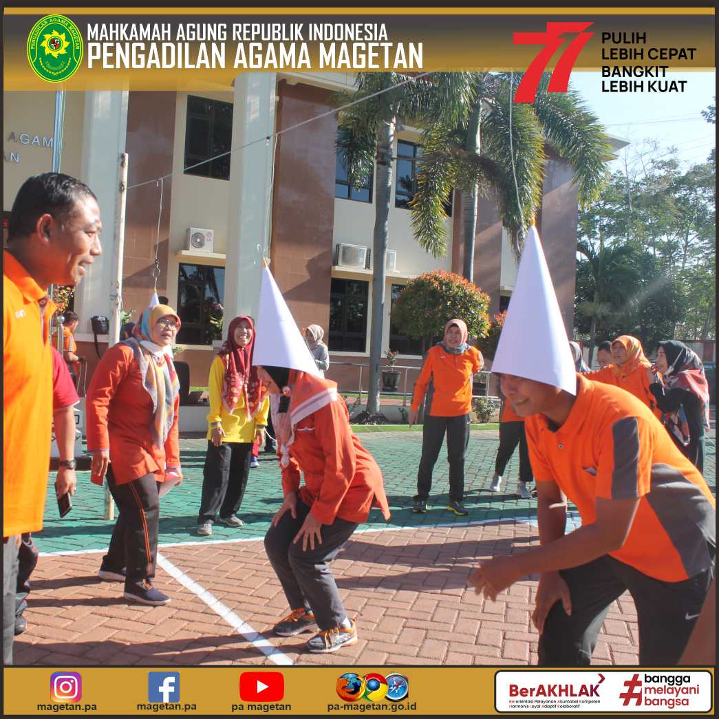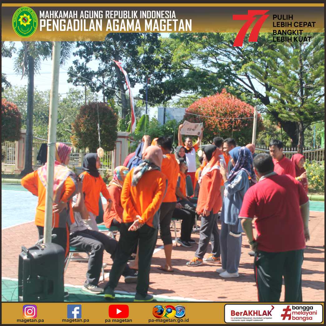 Dalam sambutannya Ketua Pengadilan Agama Magetan (YM. Eny Rianing Taro, S.Ag., M.Sy) menyampaikan bahwa kegiatan ini sebagai salah satu kesemarakan peringatan dalam merayakan beberapa acara yang ada di bulan agustus ini. Dengan kegiatan ini semoga dapat menambah kekompakan dan kerjasama antar aparatur Pengadilan Agama Magetan.