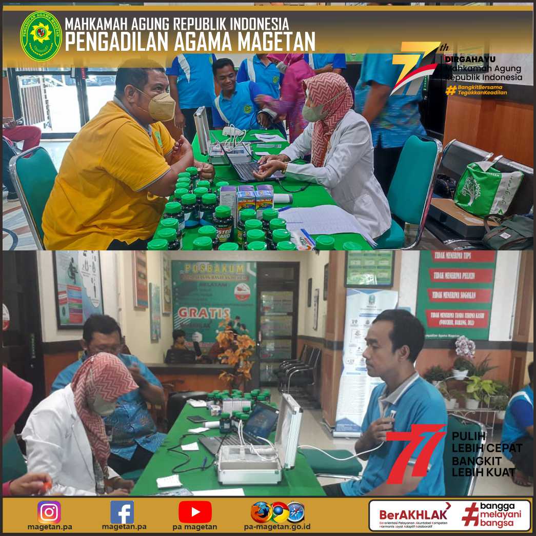 Kegiatan yang dilaksanakan di Pengadilan Agama Magetan ini merupakan salah satu kegiatan dalam rangkaian Peringatan Dirgahayu Republik Indonesia Ke 77 dan HUT Mahkamah Agung RI Ke 77 yang jatuh pada bulan Agustus ini. Cek kesehatan dan konsultasi kesehatan ini diberikan secara gratis kepada seluruh Aparatur Pengadilan Agama Magetan.