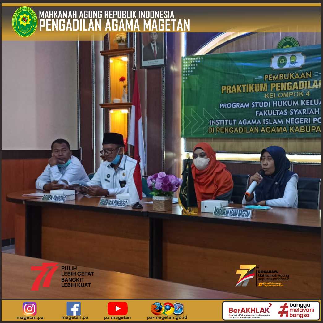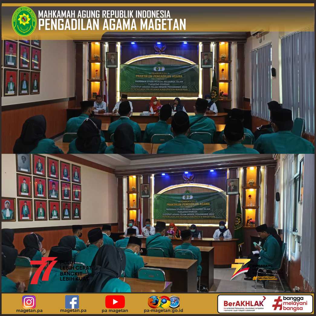 Magetan | pa-magetan.go.id | Pengadilan Agama Magetan melaksanakan Pembukaan Praktikum Pengadilan Agama Program Studi Hukum Keluarga Islam Fakultas Syariah Institut Agama Islam Negeri Ponorogo Tahun 2022. Kegiatan yang dihadiri oleh Ketua, Panitera, Sekretaris dan Dosen Pamong Pengadilan Agama Magetan serta Dosen Pembimbing Mahasiswa dari Institut Agama Islam Negeri Ponorogo. Kegiatan yang dilaksanakan di Media Center Pengadilan Agama Magetan ini juga diikuti oleh seluruh mahasiswa yang melaksanakan praktikum.