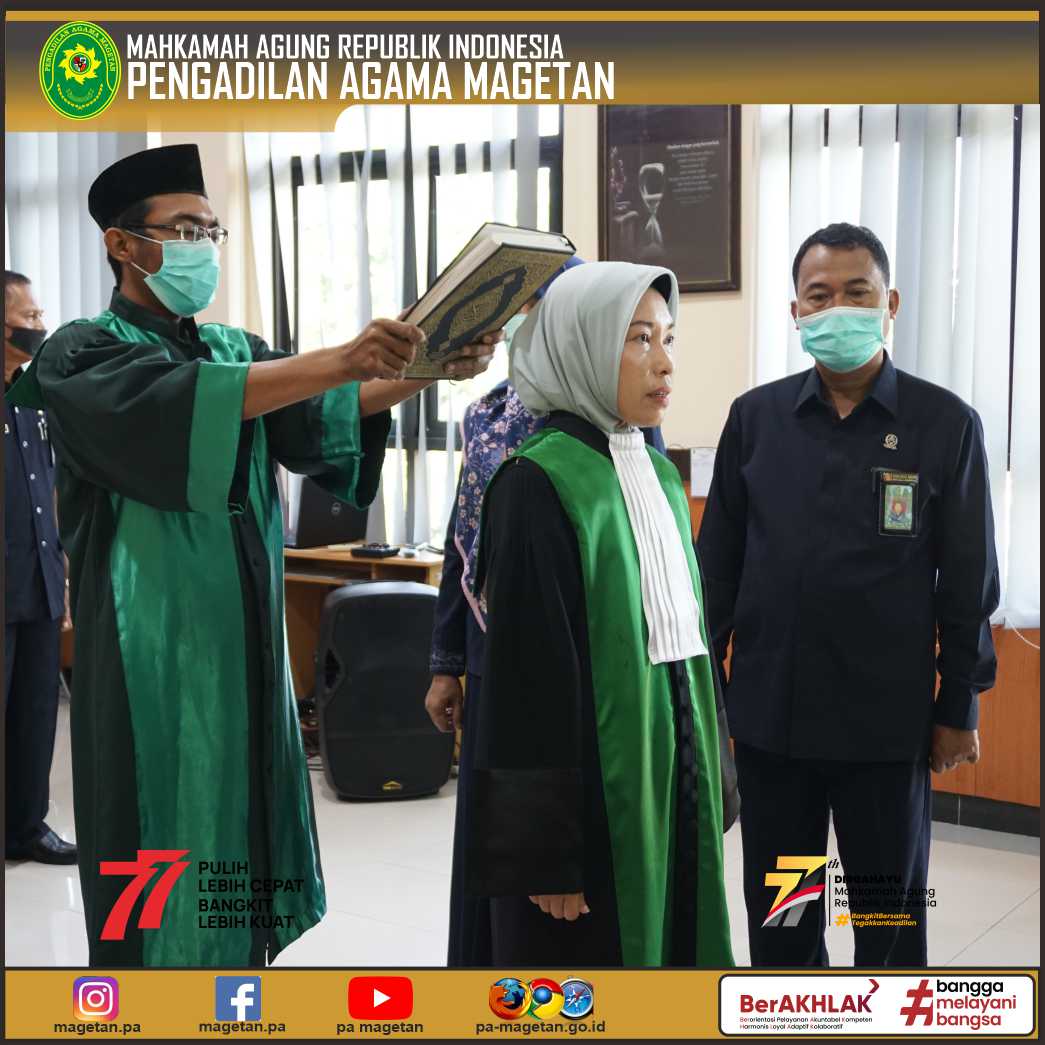 Acara pelantikan yang dilaksanakan secara langsung ini tetap memperhatikan protokol kesehatan COVID-19. Disaksikan oleh 2 orang saksi yaitu Paniteran Pengadilan Agama Magetan (Drs. Mat Busiril, M.H) dan Sekretaris Pengadilan Agama Magetan (St. Mar’atu Ulfah, S.Ag). Sebelum promosi menjadi Wakil Ketua Pengadilan Agama Magetan Kelas 1B, Ibu. Wakhidah, S.H, S.H.I, M.H menjabat sebagai Hakim Pengadilan Agama Magetan. Berdasarkan Surat Keputusan Ketua Mahkamah Agung RI No. 248/ KMA/ SEK/ VIII/ 2022 tertanggal 23 Agustus 2022 resmi dilantik menjadi Wakil Ketua Pengadilan Agama Magetan Kelas 1B.