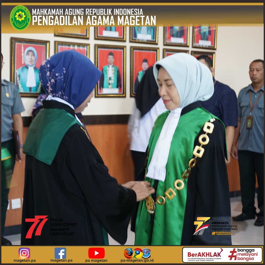 Di akhir acara, Ketua Pengadilan Agama Magetan beserta seluruh aparatur Pengadilan Agama Magetan memberikan ucapan selamat kepada Wakil Ketua Pengadilan Agama Magetan yang baru dilantik. Diharapkan dengan adanya promosi dan mutasi wakil ketua ini dapat terus meningkatkan pelayanan di Pengadilan Agama Magetan. Aamiin...