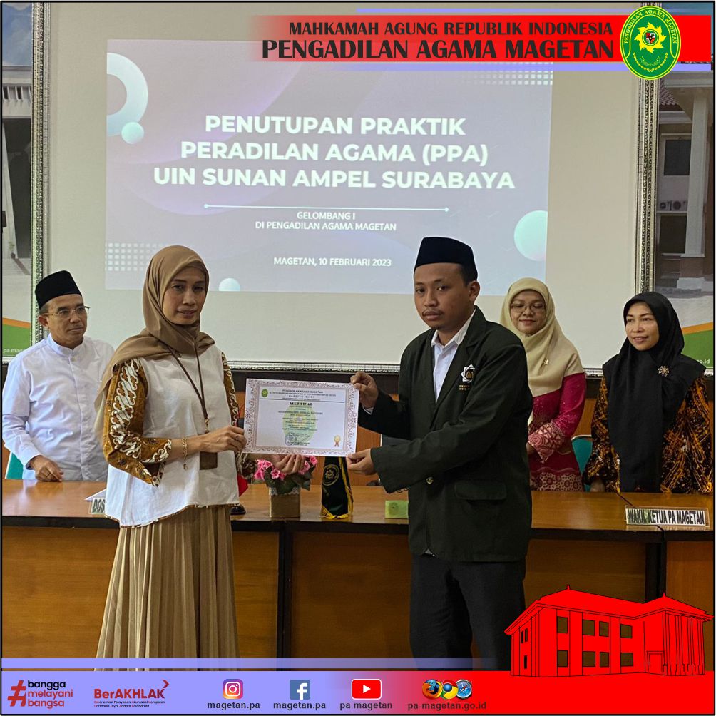 Magetan | pa-magetan.go.id | Pengadilan Agama Magetan melaksanakan Penutupan Praktik Peradilan Agama (PPA) Program Studi Hukum Fakultas Syariah dan Hukum UIN Sunan Ampel Surabaya di Media Center Pengadilan Agama Magetan. Kegiatan yang dihadiri oleh Ketua Pengadilan Agama Magetan (YM. Hj. Yurita Heldayanti, S.Ag., M.H), Wakil Ketua Pengadilan Agama Magetan (YM. Wakhidah, S.H., S.H.I., M.H.), Dosen Pamong (YM. Lusiana Mahmudah, S.H.I, M.H.), Dosen Pembimbing (Drs. Jeje Abdul Rojak, M. Ag.) dan Mahasiswa Program Studi Hukum Fakultas Syariah dan Hukum UIN Sunan Ampel Surabaya.