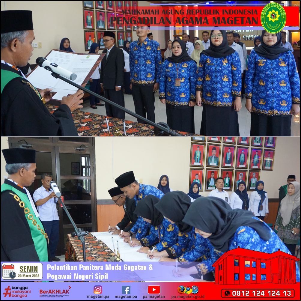 Panitera Muda Gugatan dan orang Calon Pegawai Negeri Sipil di Pengadilan Agama Magetan dilantik menjadi Pegawai Negeri Sipil di Pengadilan Agama Magetan. Masing-masing Rahmad Pujiraharja, S.H dilantik menjadi Panitera Muda Gugatan Pengadilan Agama Magetan yang sebelumnya menjabat sebagai Panitera Pengganti Pengadilan Agama Tuban. Selanjutnya Saudara Diky Dwi Setiadi, S.H, Saudari Izza Aliyatul Millah, S.H, dan Saudari Amalia Esa Kartika, S.H dilantik menjadi Analis Perkara Peradilan Pengadilan Agama Magetan sedangkan Saudari Titin Oktaviani, S.IAN dilantik menjadi Analis Perencanaan, Evaluasi dan Pelaporan di Pengadilan Agama Magetan.