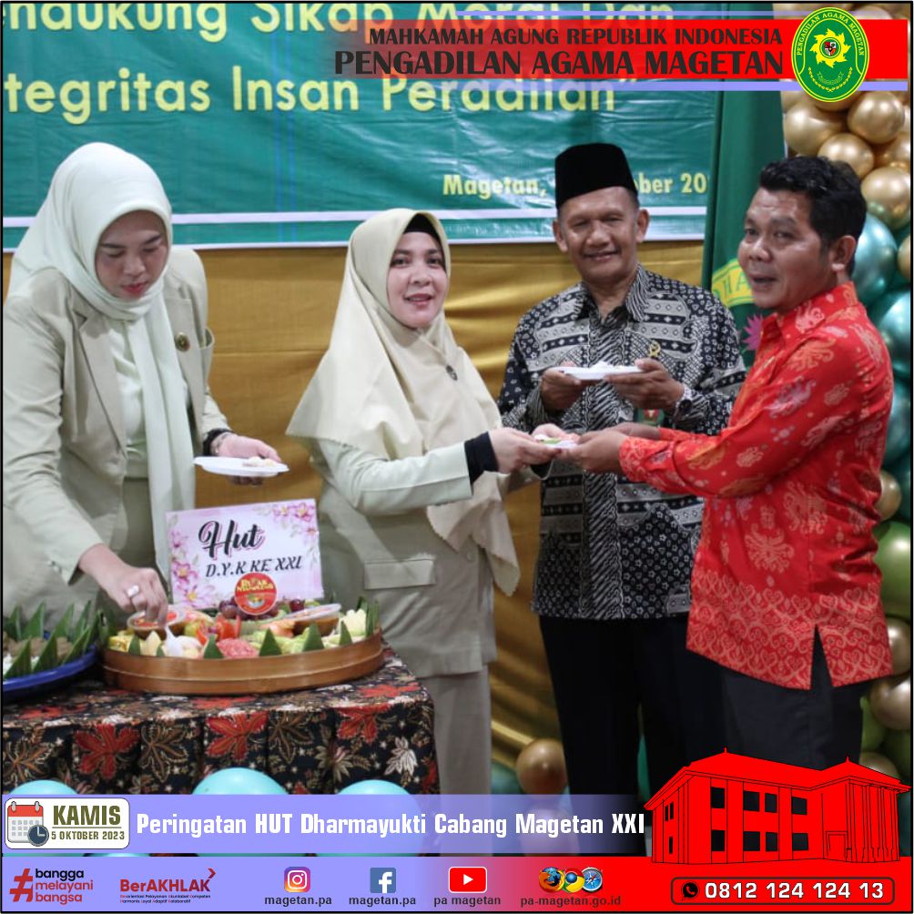 Magetan | pa-magetan.go.id | Pengadilan Agama Magetan menjadi tuan rumah Peringatan Hari Ulang Tahun (HUT) Dharmayukti Cabang Magetan XXI. Peringatan Hari Ulang Tahun (HUT) Dharmayukti Cabang Magetan XXI mengambil Tema yaitu “Dengan Semangat Hari Ulang Tahun XXI Dharmayukti Karini Mendukung SIkap Moral dan Menjunjung Tinggi Integritas Insan Peradilan”