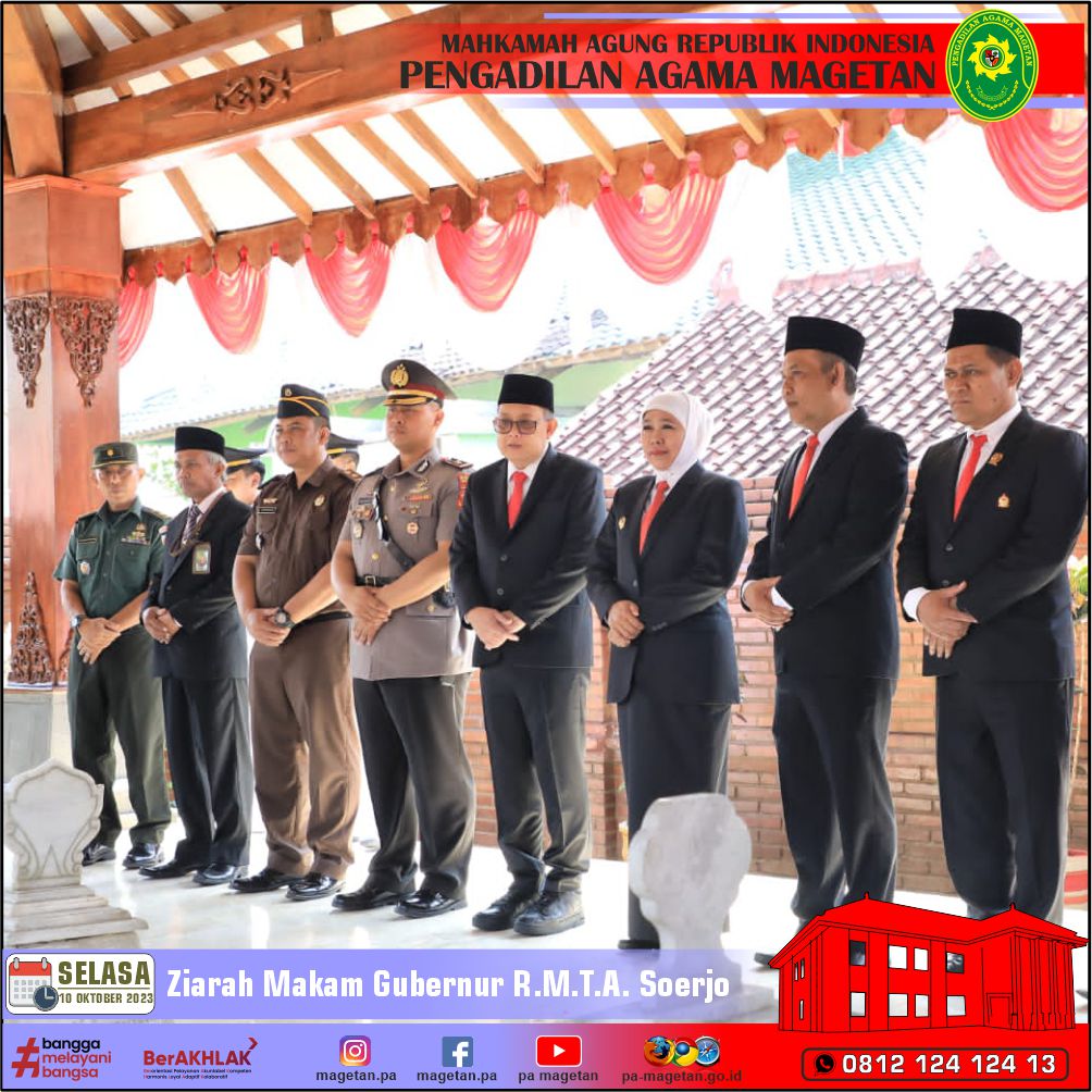 Magetan | pa-magetan.go.id | Ketua Pengadilan Agama Magetan mengikuti kegiatan Ziarah Makam Gubernur R.M.T.A. Soerjo di Jalan Salak, Magetan. Kegiatan ini merupakan salah satu serangkaian kegiatan dalam rangka menyambut Hari Jadi Ke-78 Provinsi Jatim & Hari Jadi Ke - 348 Kabupaten Magetan. Kegiatan ini dipimpin langsung oleh Gubernur Jawa Timur (Dra. Hj. Khofifah Indar Parawansa, M.Si.) dan diikuti oleh Sekdaprov Jatim, para Kepala OPD Pemprov Jatim, Pj Bupati Magetan, Ketua DPRD Kabupaten Magetan, serta Forkopimda Kab. Magetan dan jajaran OPD Kab. Magetan