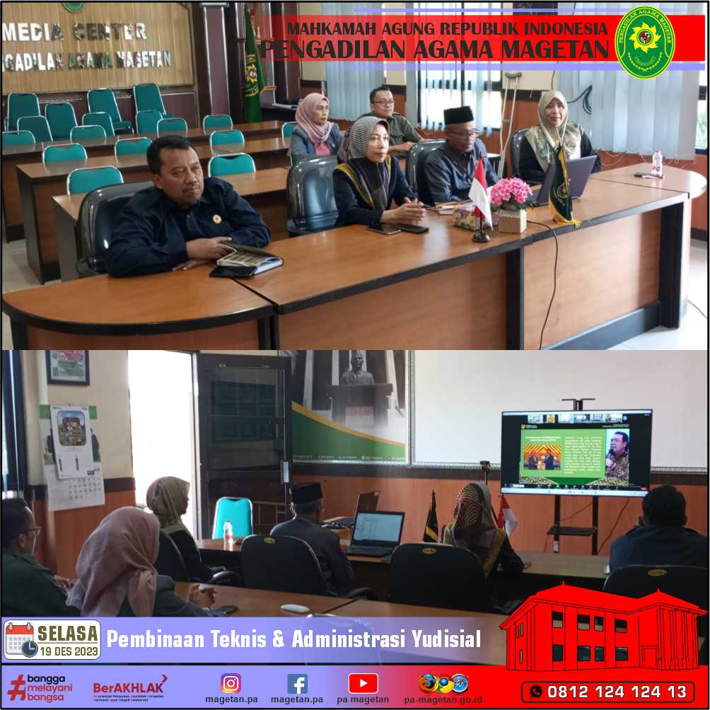 Magetan | pa-magetan.go.id | Pengadilan Agama Magetan diwakili oleh Ketua, Hakim, Panitera, Sekretaris dan Aparatur Pengadilan Agama Magetan mengikuti Pembinaan Bidang Teknis dan Administrasi Yudisial secara online dari Media Center Pengadilan Agama Magetan. Kegiatan yang dilaksanakan dari Hotel The Natsepa Resort & Conference Center Ambon, Jl. Natsepa no.36, Suli, Kec. Salahutu, Kab. Maluku Tengah, Maluku. Kegiatan ini berlangsung selama 2 hari, mulai kemarin (18/12/23) sampai hari ini (19/12/23). Kegiatan ini menindaklanjuti surat undangan Wakil Ketua Mahkamah Agung Bidang Yudisial Nomor: 68/WKMA.Y/UND/XII/2023 tanggal 04 Desember 2023.