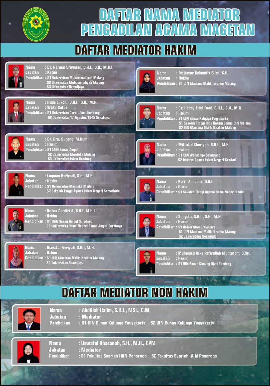 Daftar Nama Mediator Written by Admin on 12 January 2021. Written by Admin on 12 January 2021. Hits: 6027 DAFTAR NAMA MEDIATOR SK MEDIATOR