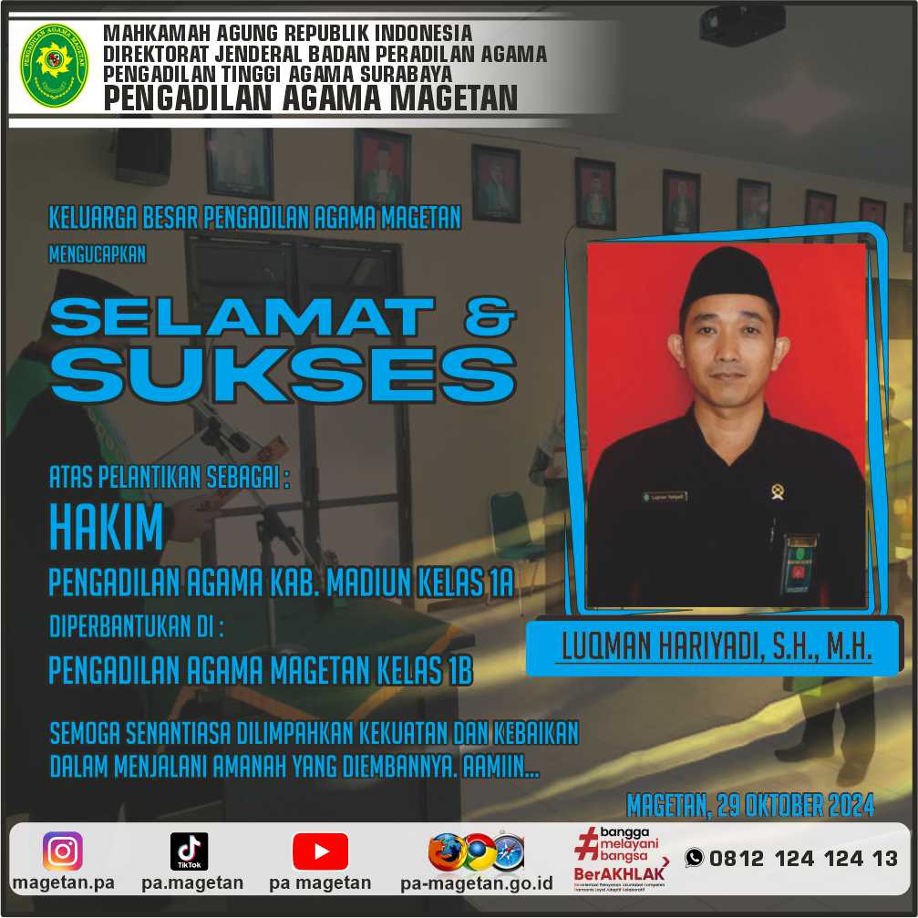 Selamat & Sukses Luqman Hariyadi, S.H., M.H. Written by Admin on 29 October 2024. Written by Admin on 29 October 2024. Hits: 451
