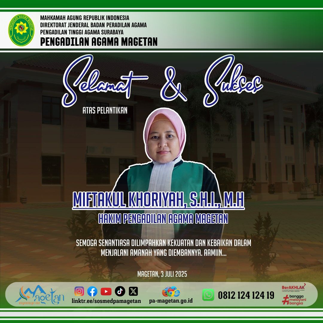 Selamat & Sukses Miftakul Khoriyah, S.HI., M.H. Written by Admin on 03 July 2025. Written by Admin on 03 July 2025. Hits: 281