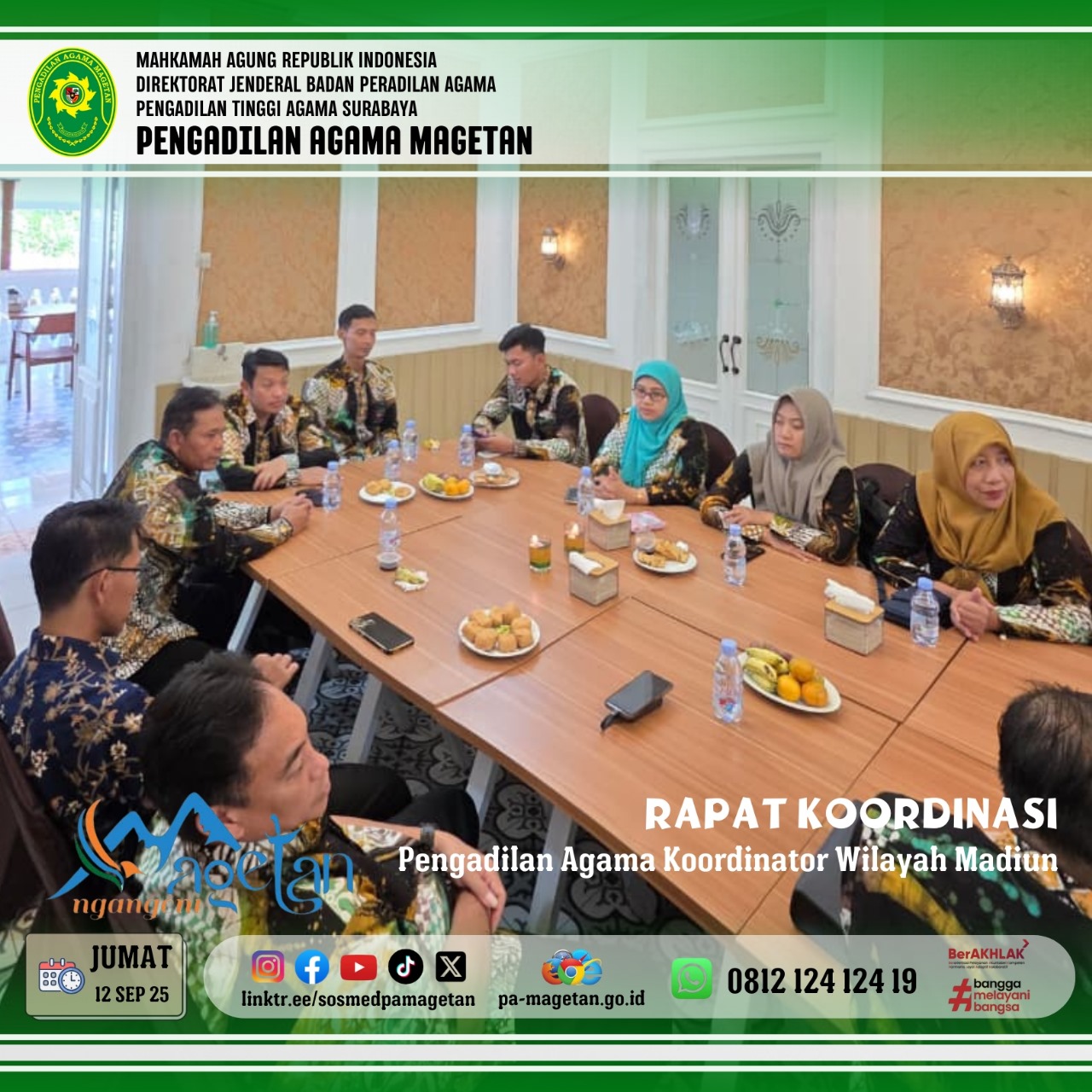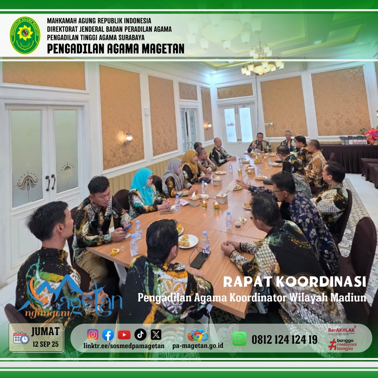 Magetan, 12 September 2025 – Pengadilan Agama Ponorogo menjadi tuan rumah Rapat Koordinasi (Rakor) Pengadilan Agama Koordinator Madiun pada Jumat (12/9). Kegiatan ini dihadiri oleh Ketua Pengadilan Agama Magetan, Dr. Hermin Sriwulan, S.H.I., S.H., M.H.I., Panitera Hj. Nilna Niamatin, S.H., M.H., serta para ketua, panitera, dan sekretaris sekoordinator Madiun.